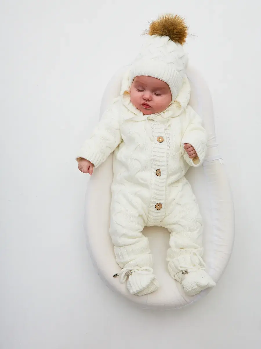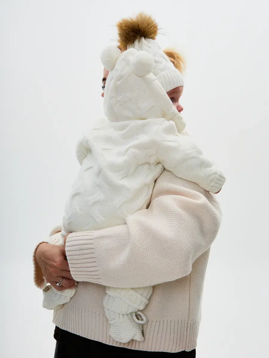 Изнутри комбинезон полностью утеплён велсофтом — это мягкая и тёплая ткань, которая хорошо сохраняет тепло и не вызывает раздражения на коже малыша. Эксклюзивная вязка делает комбинезон стильным и нарядным, а натуральная шерсть в составе обеспечивает отличные терморегулирующие свойства и позволяет коже малыша дышать.