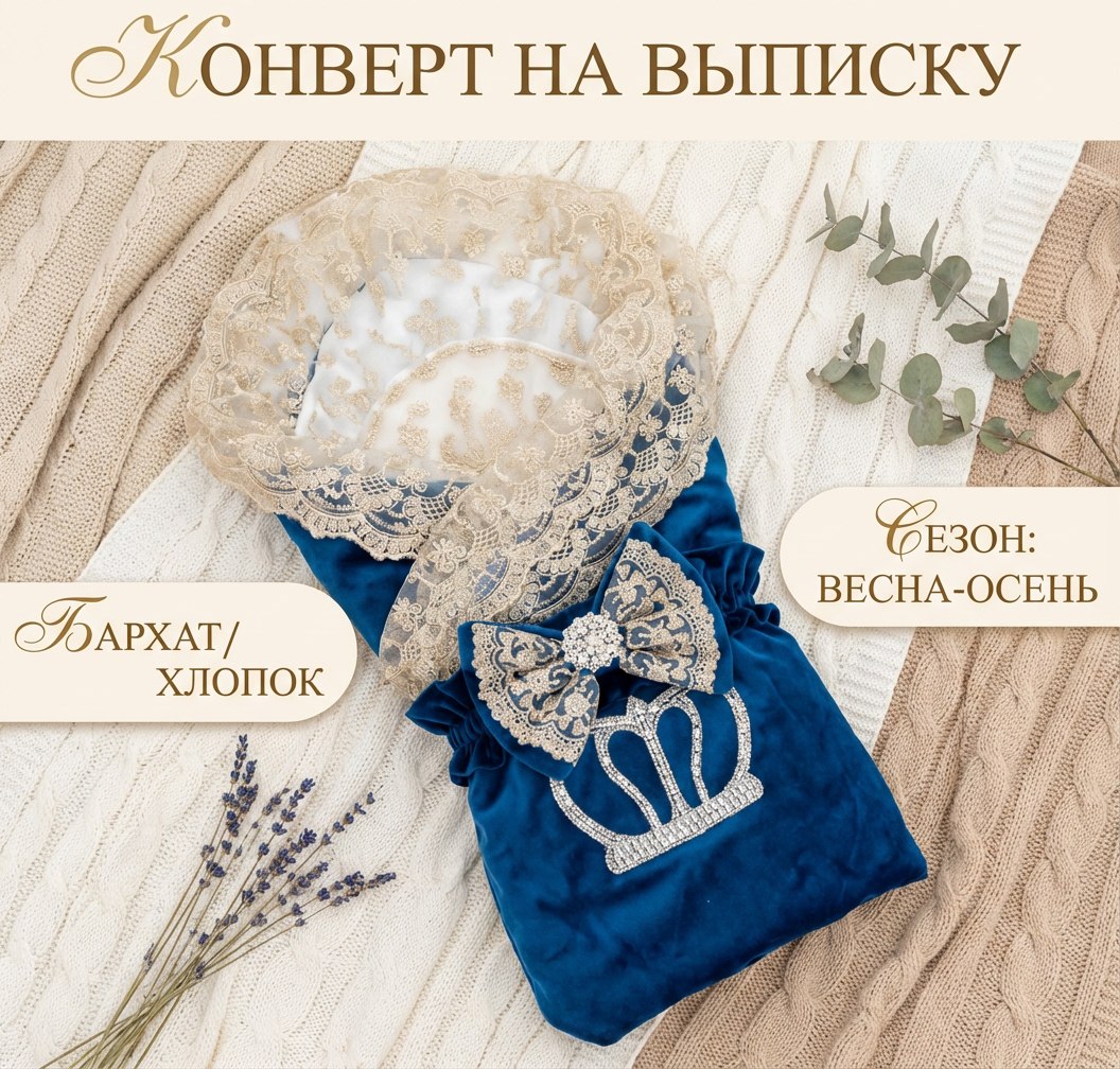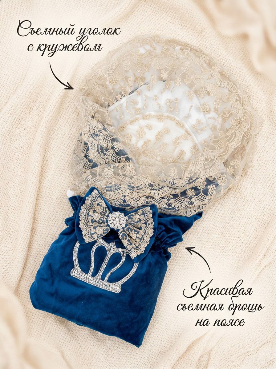 Элегантный конверт для выписки новорожденного из бархатной и хлопковой ткани. Идеален для создания запоминающегося образа в важный момент. Поставляется без костюма. Удобный и стильный, украшен изысканной кружевной отделкой и декоративным бантом с короной. Подходит для использования в холодное время года. Отличный выбор для родителей, ценящих комфорт и красоту.