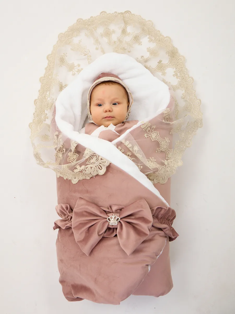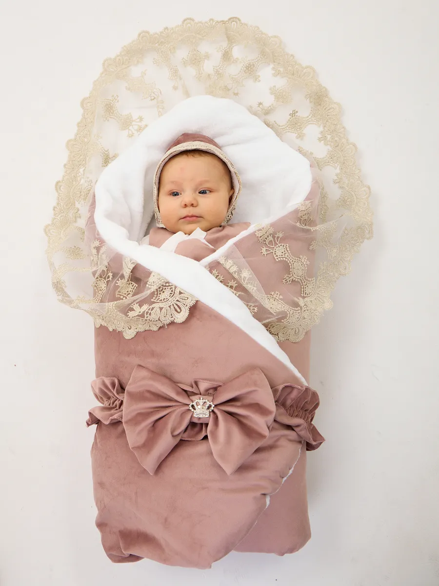 Элегантный конверт для выписки новорожденного из бархатной и хлопковой ткани. Идеален для создания запоминающегося образа в важный момент. Поставляется без костюма. Удобный и стильный, украшен изысканной кружевной отделкой и декоративным бантом с короной. Подходит для использования в холодное время года. Отличный выбор для родителей, ценящих комфорт и красоту.