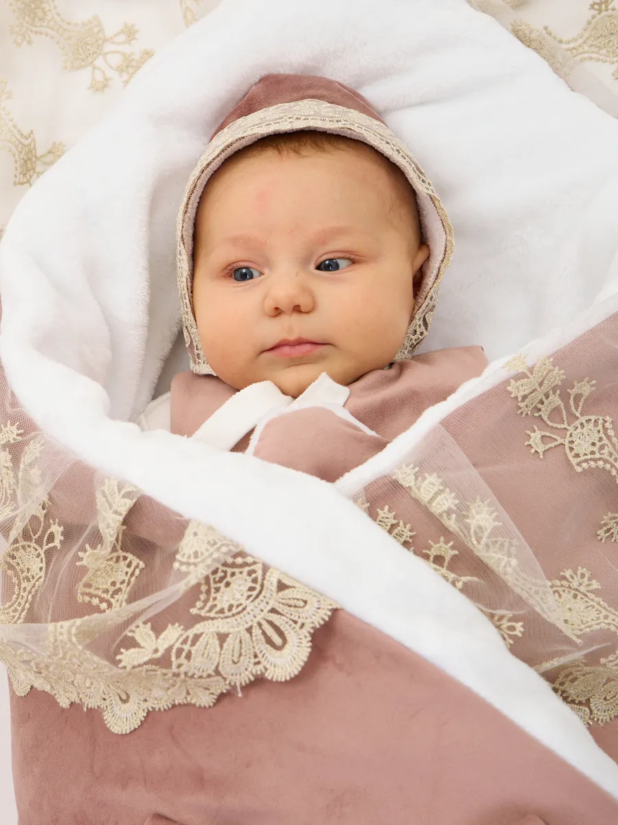 Конверт на выписку для новорожденного из нежного бархата. Кружево к одеялу пришито.