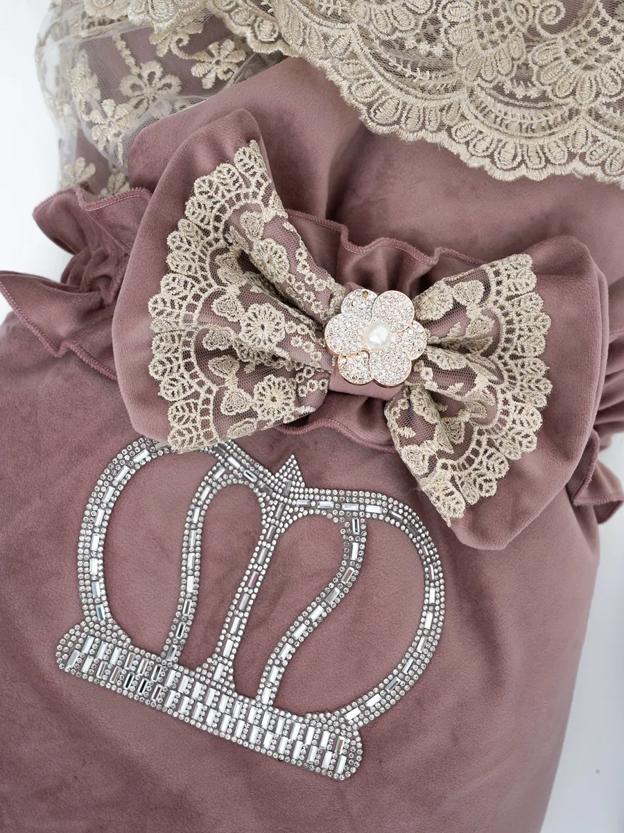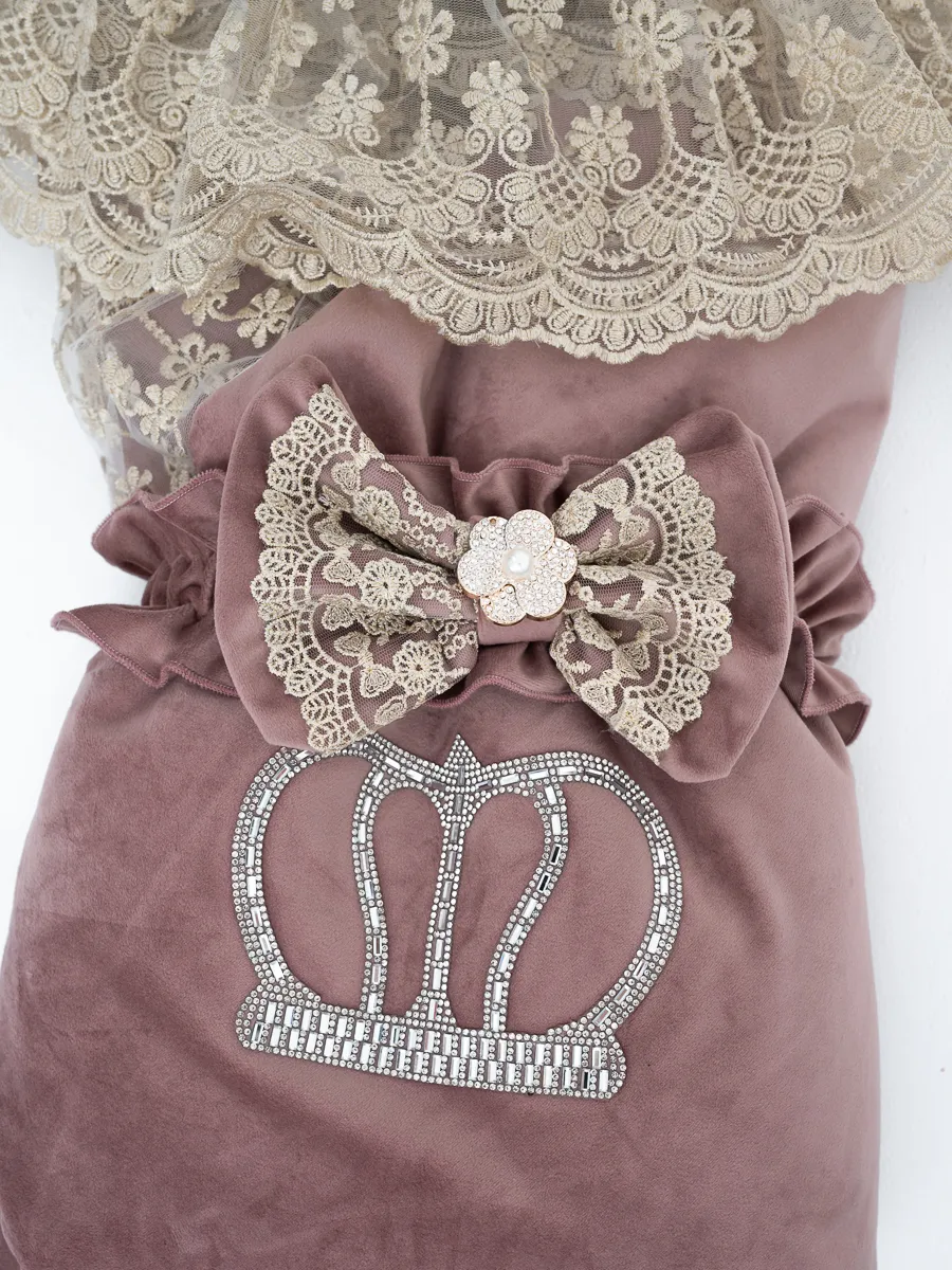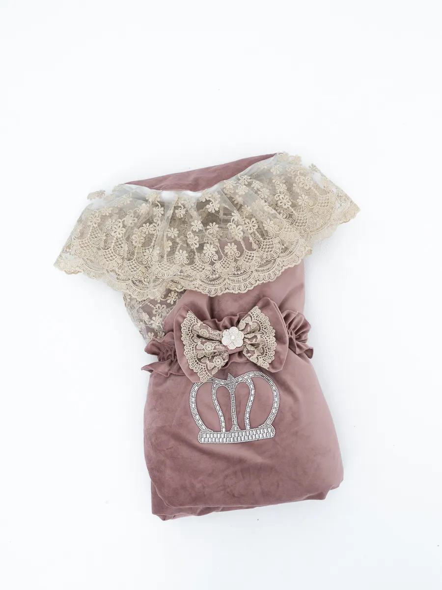 Элегантный конверт для выписки новорожденного из бархатной и хлопковой ткани. Идеален для создания запоминающегося образа в важный момент. Поставляется без костюма. Удобный и стильный, украшен изысканной кружевной отделкой и декоративным бантом с короной. Подходит для использования в холодное время года. Отличный выбор для родителей, ценящих комфорт и красоту.