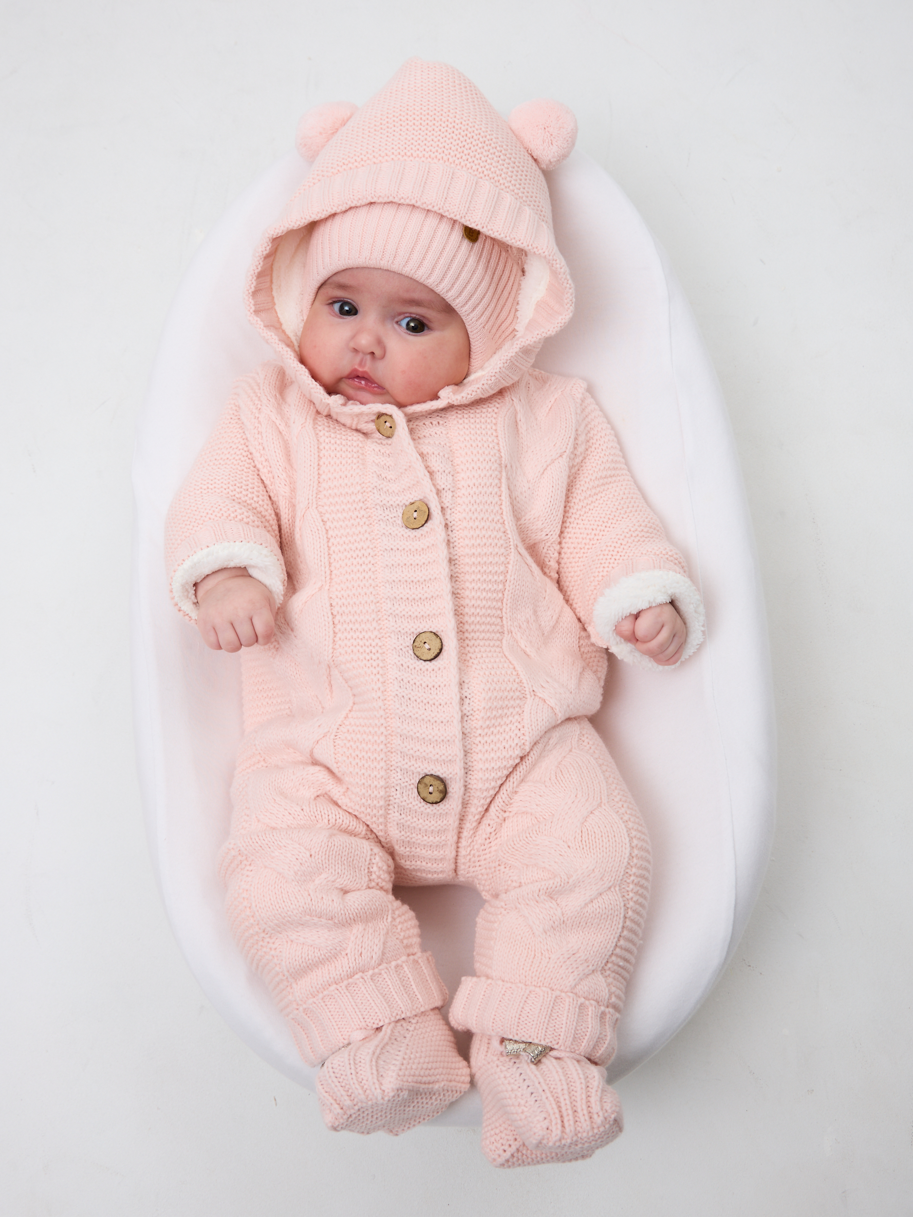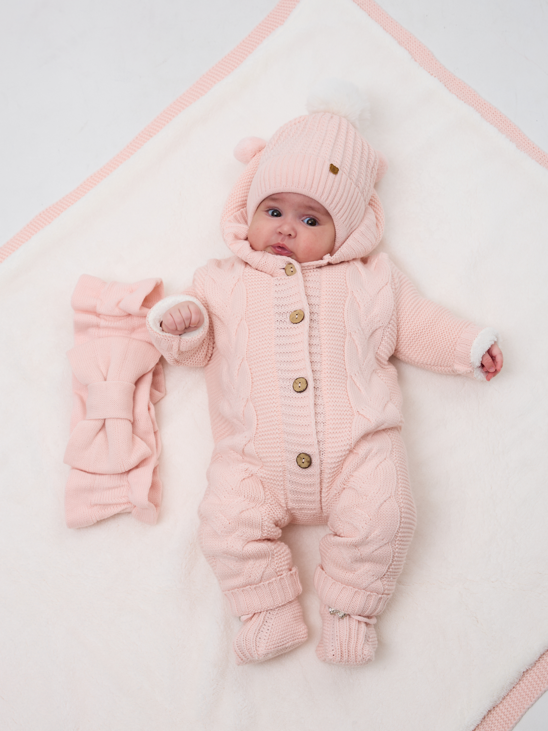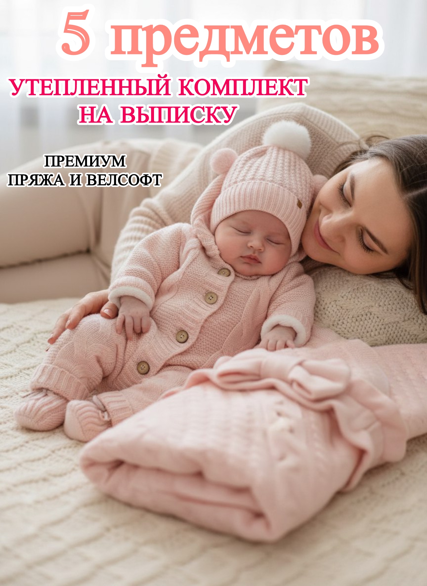 Представляем вам идеальный комплект на выписку новорожденного — вязаный набор из 5 предметов. Он включает в себя самые необходимые вещи для первых дней жизни малыша: плед, пояс, шапочку, пинетки и тёплый комбинезон с капюшоном.
