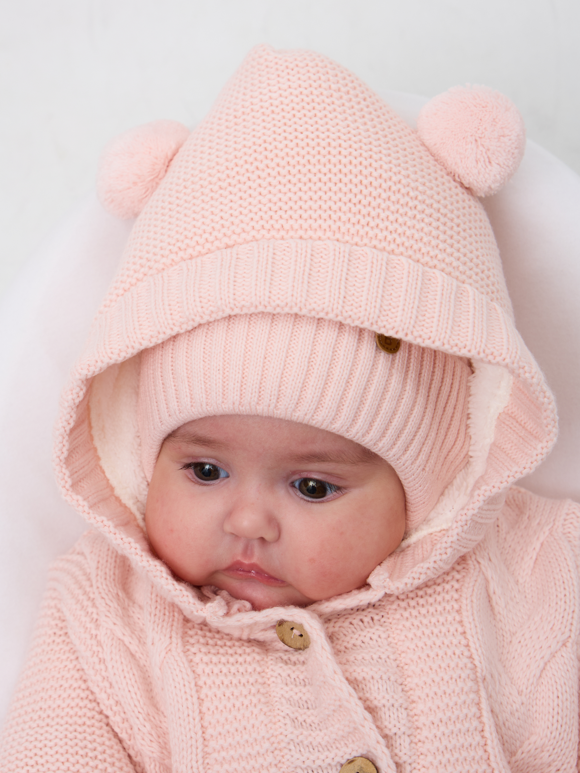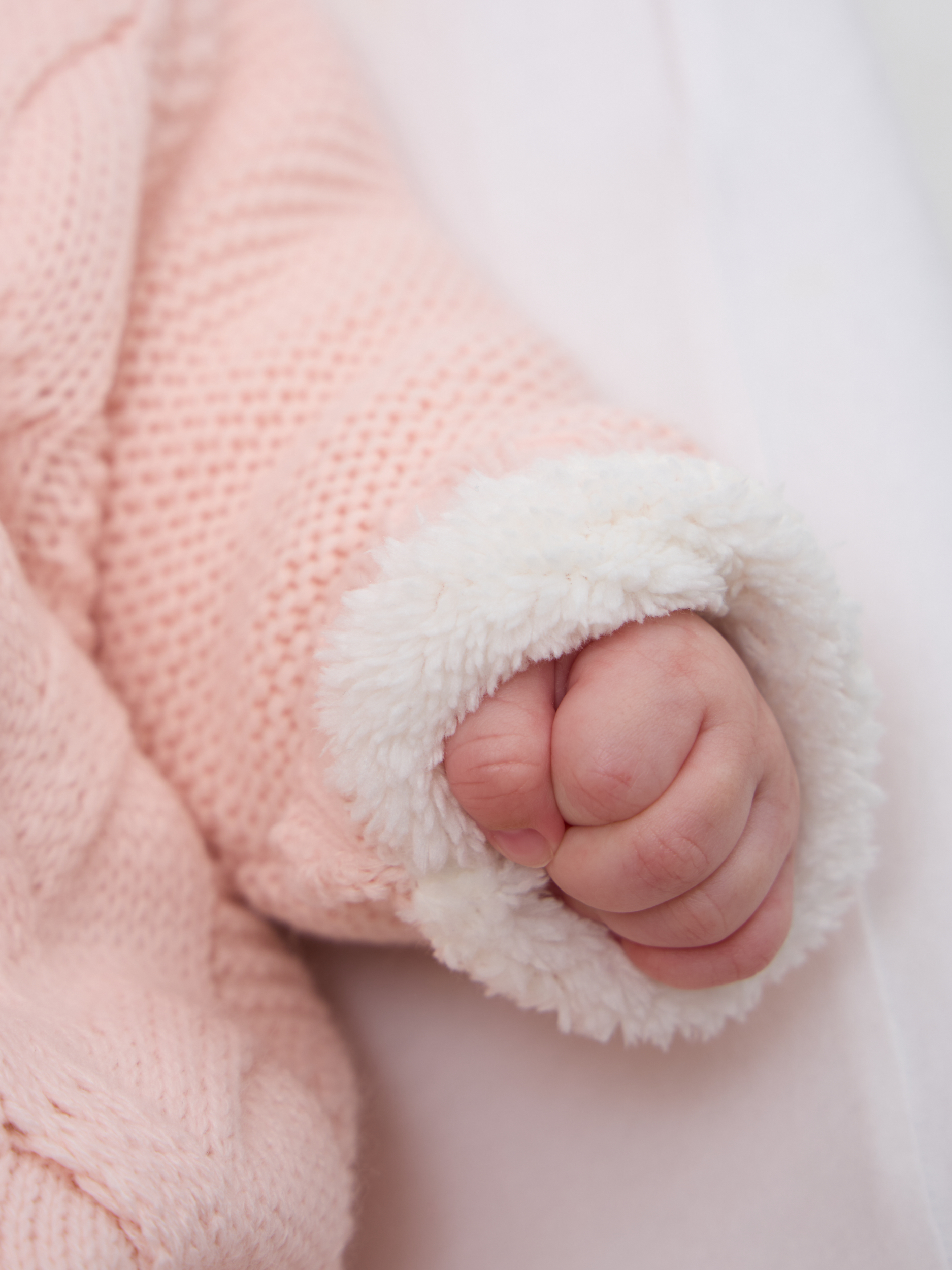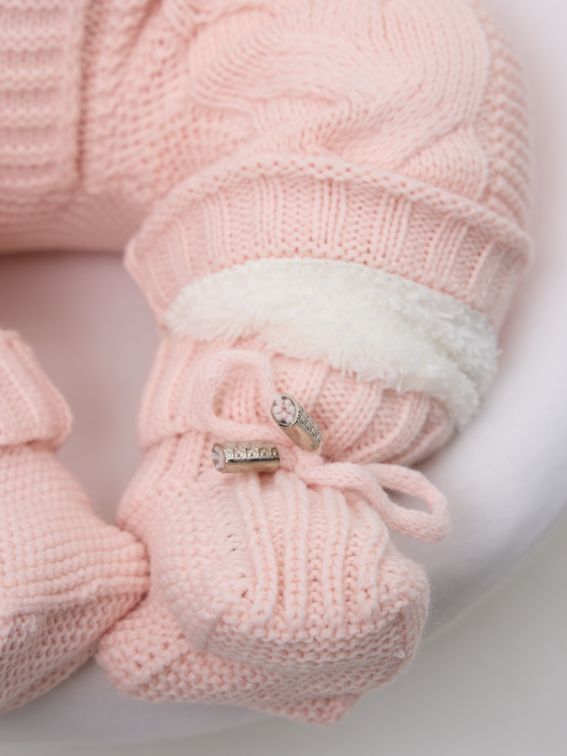 Конверт на выписку состоит из вязаного пледа размером 120x80 см, утеплённого экомехом (велсофт). Он надёжно фиксируется на малыше благодаря поясу-банту на резинке, не пережимая его тело. Также в комплект входит шапочка размером 40 на завязках с милым помпоном. И, конечно же, вязаные пинетки — они изготовлены из турецкой премиум-пряжи, как и весь зимний конверт.