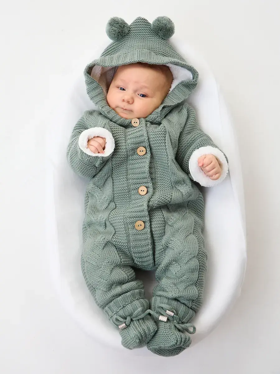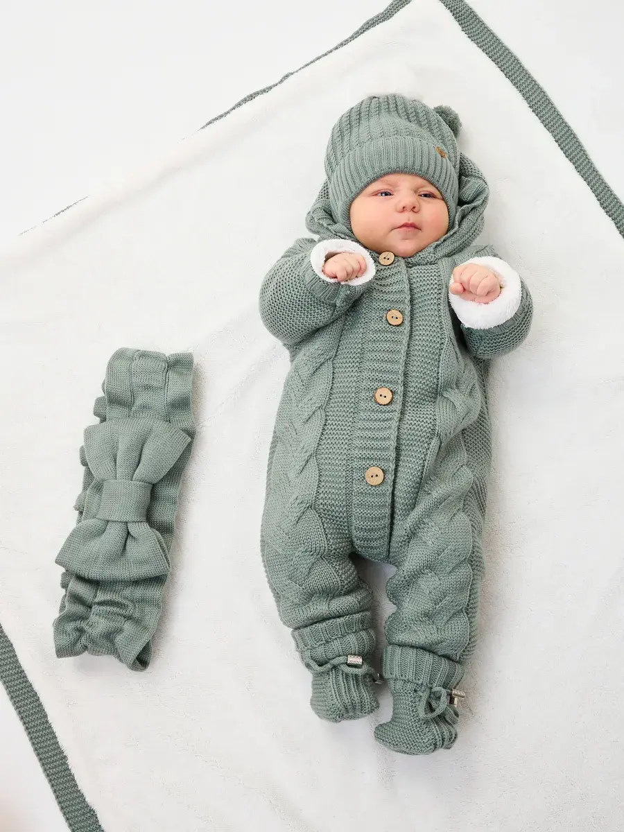 Представляем вам идеальный комплект на выписку новорожденного вязаный набор из 5 предметов. Он включает в себя самые необходимые вещи для первых дней жизни малыша: плед, пояс, шапочку, пинетки и тёплый комбинезон с капюшоном. Конверт на выписку состоит из вязаного пледа размером 120x80 см, утеплённого экомехом (велсофт). Он надёжно фиксируется на малыше благодаря поясу-банту на резинке, не пережимая его тело. Также в комплект входит шапочка размером 40 на завязках с милым помпоном. И, конечно же, вязаные пинетки — они изготовлены из турецкой премиум-пряжи, как и весь зимний конверт.