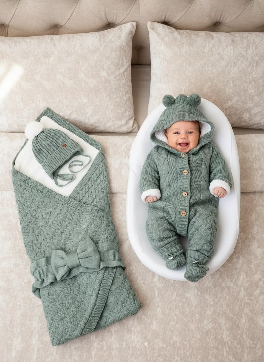 Комбинезон полностью утеплён экомехом и связан из мягчайшей пряжи. Конверт-одеяло на выписку — это комфорт и удобство для вашего малыша. Отлично сохраняет тепло и подходит для прогулок в коляске при температуре от −10°С до +15 °С. Все изделия в комплекте сертифицированы и отличаются высоким качеством и практичностью. Они надолго станут любимыми предметами в гардеробе вашего ребёнка.