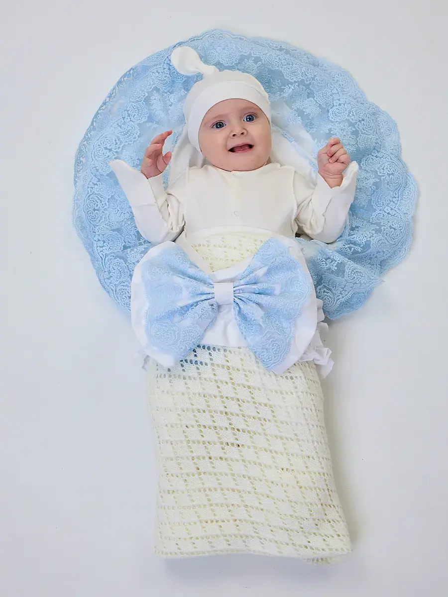 Костюм в комплект не входит. Вязаный плед для новорождённого: идеальный выбор для летней выписки. Наш вязаный плед размером 100х100 см станет отличным выбором! Мягкий и приятный на ощупь плед обеспечит комфорт вашему малышу. Стильный дизайн: съёмный кружевной уголок и пояс придают пледу элегантный вид. Состав пледа — 70% хлопка и 30% акрила, что гарантирует его качество и долговечность.Внимание !!! Рисунок кружева может отличаться в зависимости от партии!!! Нарядный конверт для новорожденного можно дополнить комбинезоном или платьем. В нашем магазине представлены модели подходящие под данный комплект.В дальнейшем плед можно использовать в коляске или кроватке. Также этот набор - станет необычным и очень практичным подарком молодым родителям на рождения малыша. Вы нас очень поддержите оставив отзыв после покупки! Благодарим за выбор и доверие!