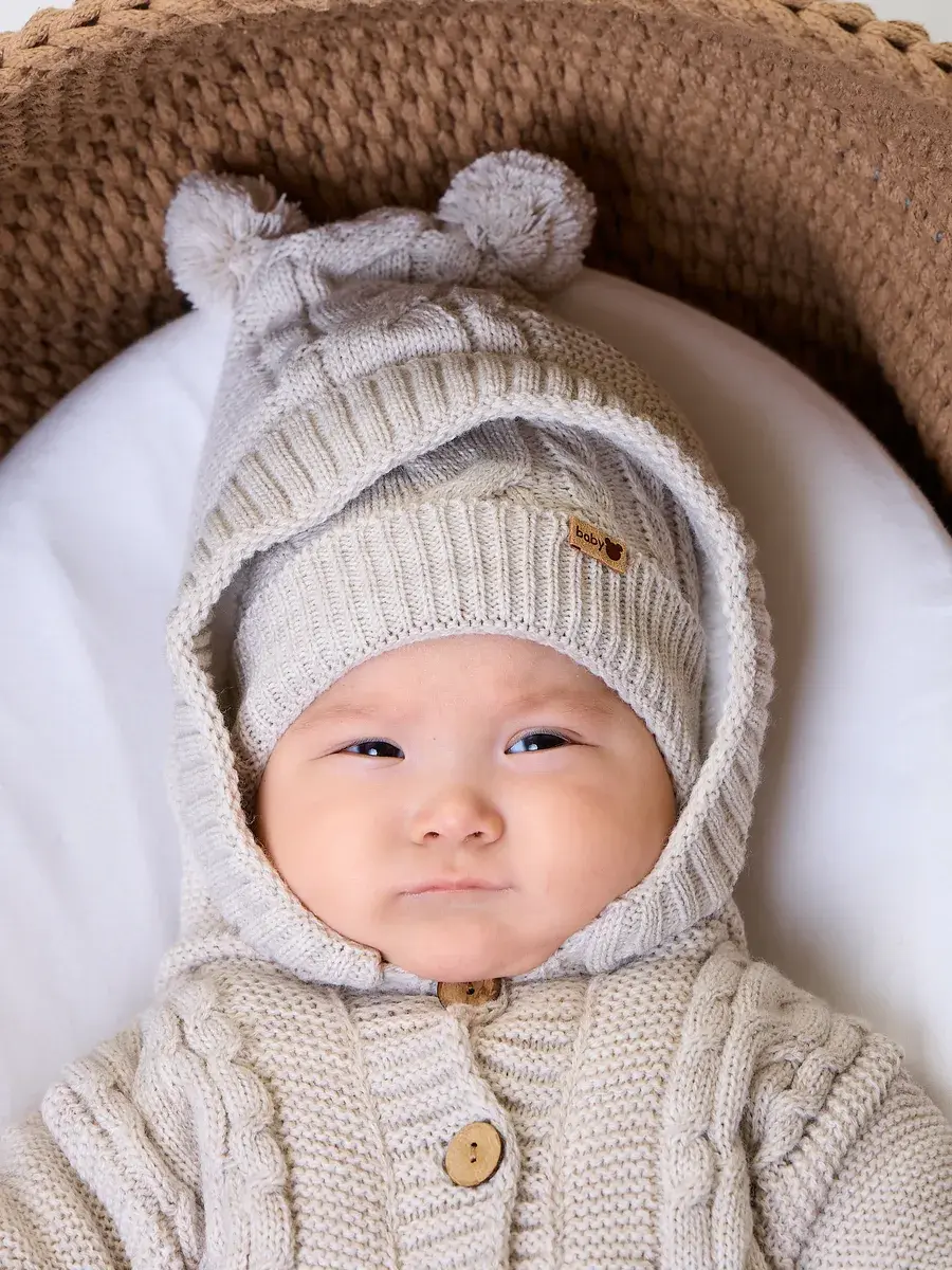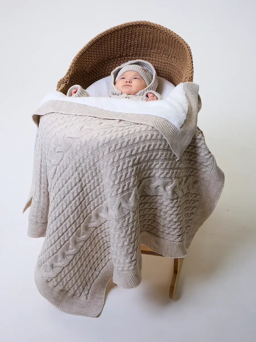 Представляем вам идеальный теплый комплект на выписку новорожденного вязаный набор из 5 предметов. Он включает в себя самые необходимые вещи для первых дней жизни малыша: плед, пояс, шапочку, пинетки и тёплый комбинезон с капюшоном. Конверт на выписку состоит из вязаного пледа размером 120x80 см, утеплённого экомехом (велсофт). Он надёжно фиксируется на малыше благодаря поясу-банту на резинке, не пережимая его тело. Также в комплект входит шапочка размером 40 на завязках с милым помпоном. И, конечно же, вязаные пинетки — они изготовлены из турецкой премиум-пряжи, как и весь зимний конверт.