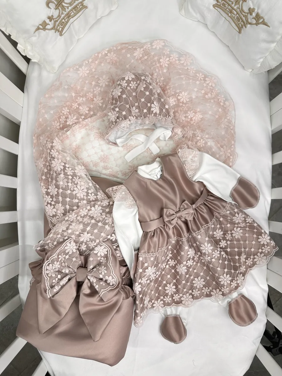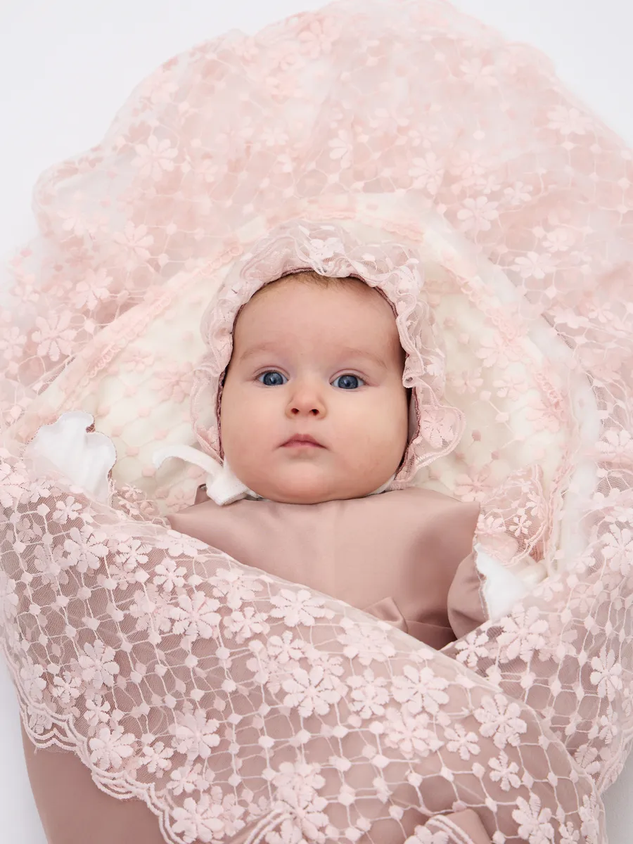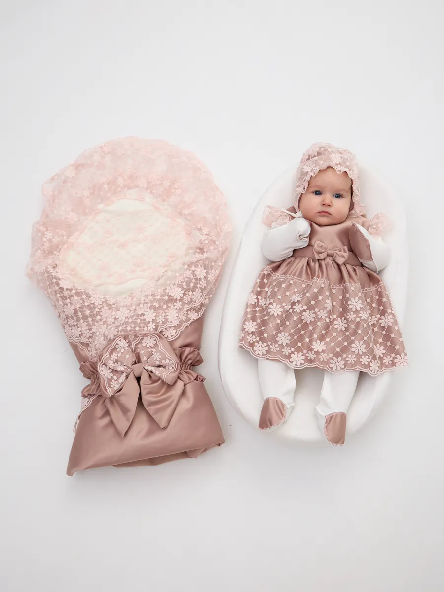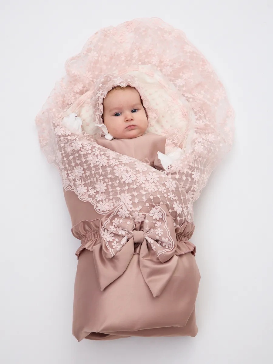 Конверт на выписку весна это прекрасный выбор для встречи новорожденной девочки из роддома. Этот комплект, выполненный в нежной пудровой расцветке с очаровательным кружевом в цветочки, создаст уютную и стильную атмосферу для первого выхода малыша на улицу. Конверт для девочки из коллекции весна 2026 изготовлен из дышащего материала с утеплителем холлофайбер, что обеспечивает комфортную температуру для крохи в диапазоне от +5С до +20С. Ветрозащитная конструкция и возможность полного расстегивания конверта гарантируют удобство использования как в роддоме, так и дома. Комплект на выписку включает в себя не только конверт, но и милое платье, удобный комбинезон и мягкий чепчик, создавая полный образ для маленькой принцессы. Конверт фиксируется на пояс бант с резинкой, что обеспечивает надежную фиксацию и удобство при надевании. Мягкая подкладка из хлопка приятна к нежной коже малыша. Декоративное кружево добавляет конверту на выписку особую изящность и шарм. После использования конверт можно легко постирать в деликатном режиме при 30С без отжима, сохраняя его первоначальный вид.