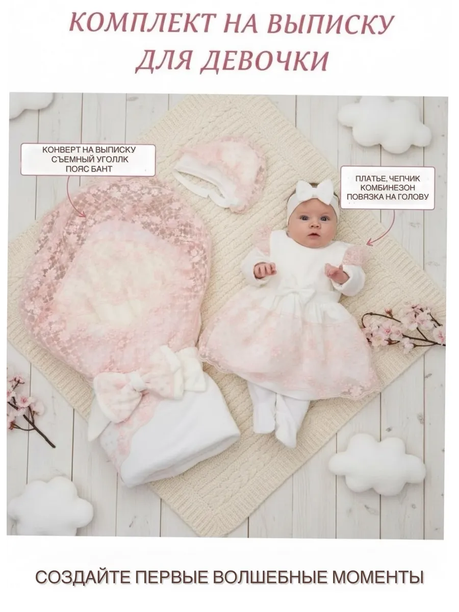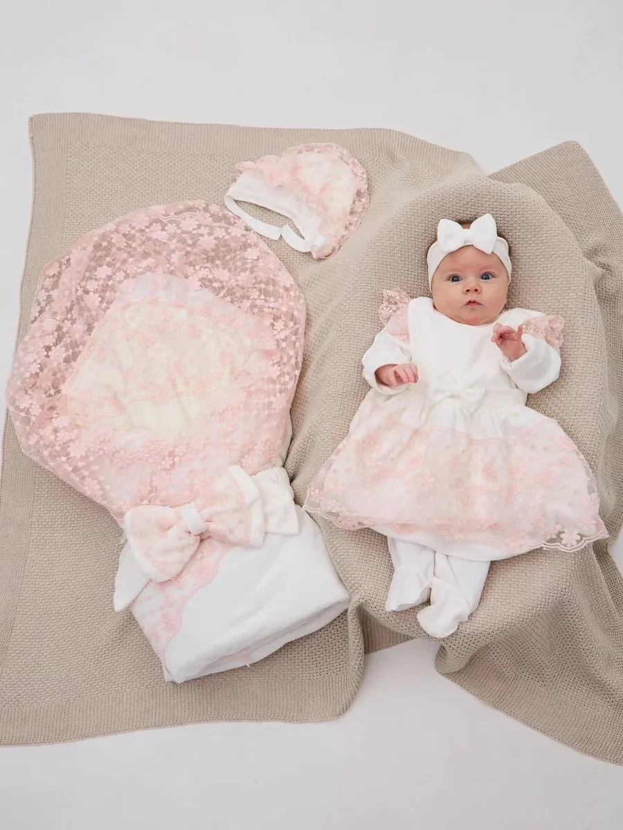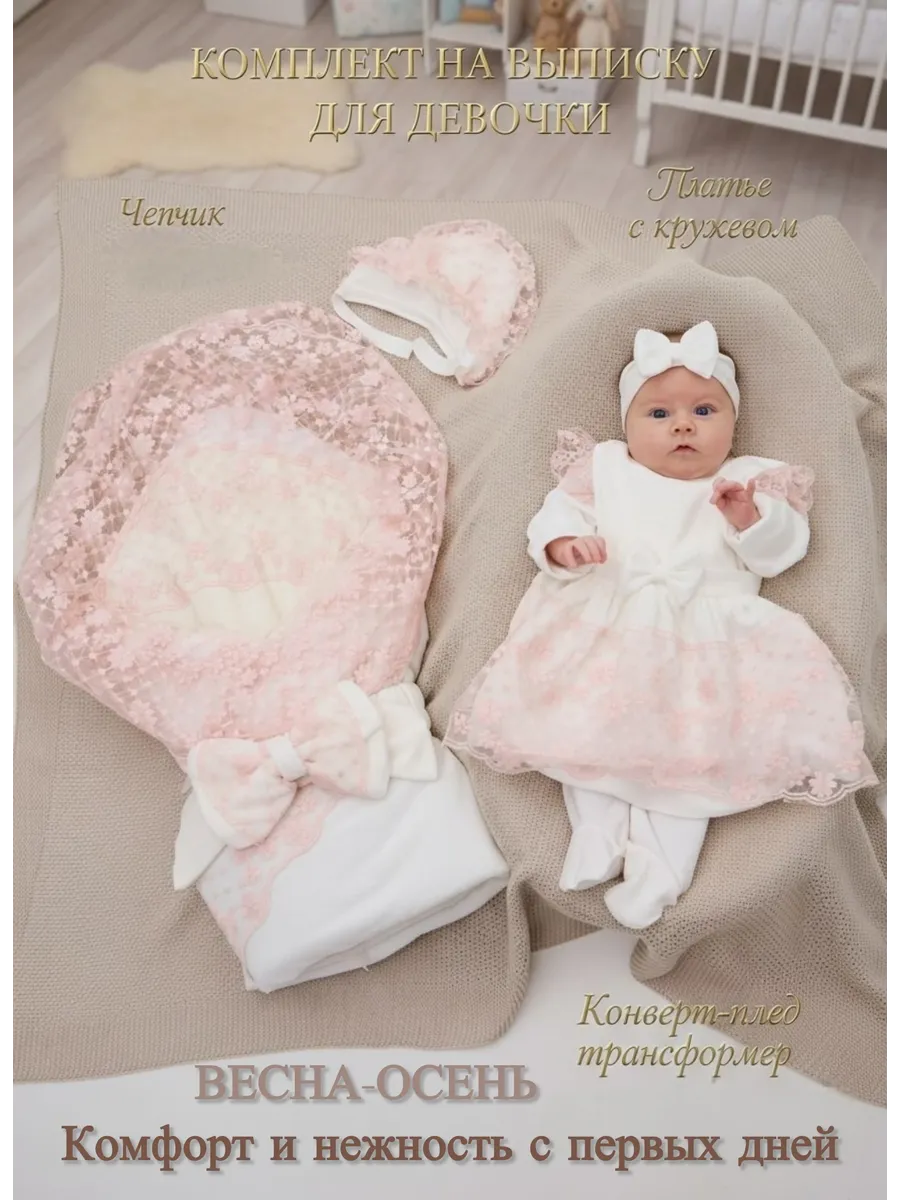 Уникальный комплект на выписку весна-осень – идеальное решение для первых дней жизни вашего малыша вне роддома. Он разработан с заботой о максимальном комфорте и безопасности в прохладное время года. Включает в себя все необходимые элементы: конверт-одеяло со съемным кружевом, нательный комбинезон, чепчик, повязка на голову и платье кружевное, пояс-бант на резинке. Каждая деталь коллекции продумана до мелочей, чтобы обеспечить тепло, удобство и стильный внешний вид.