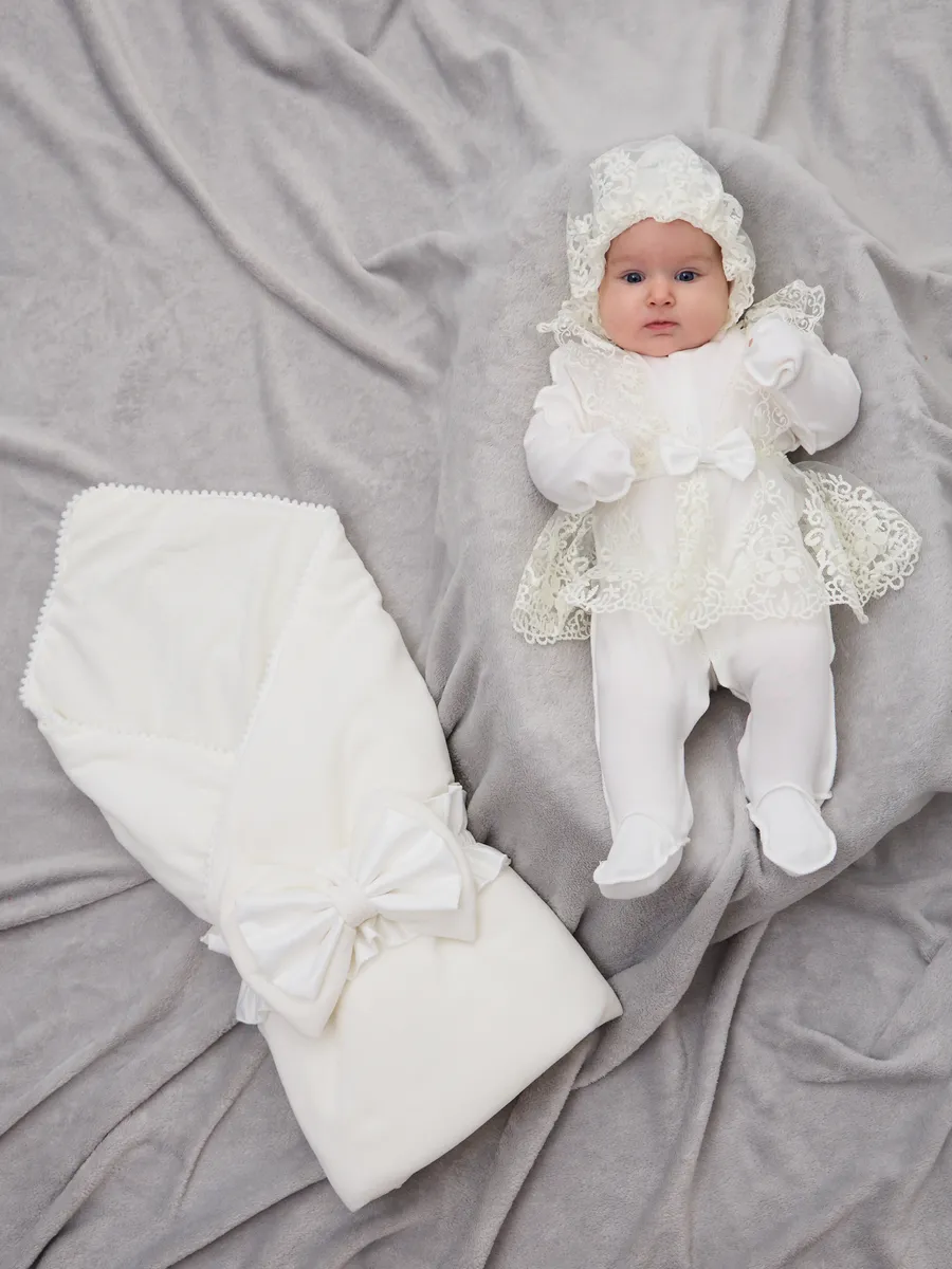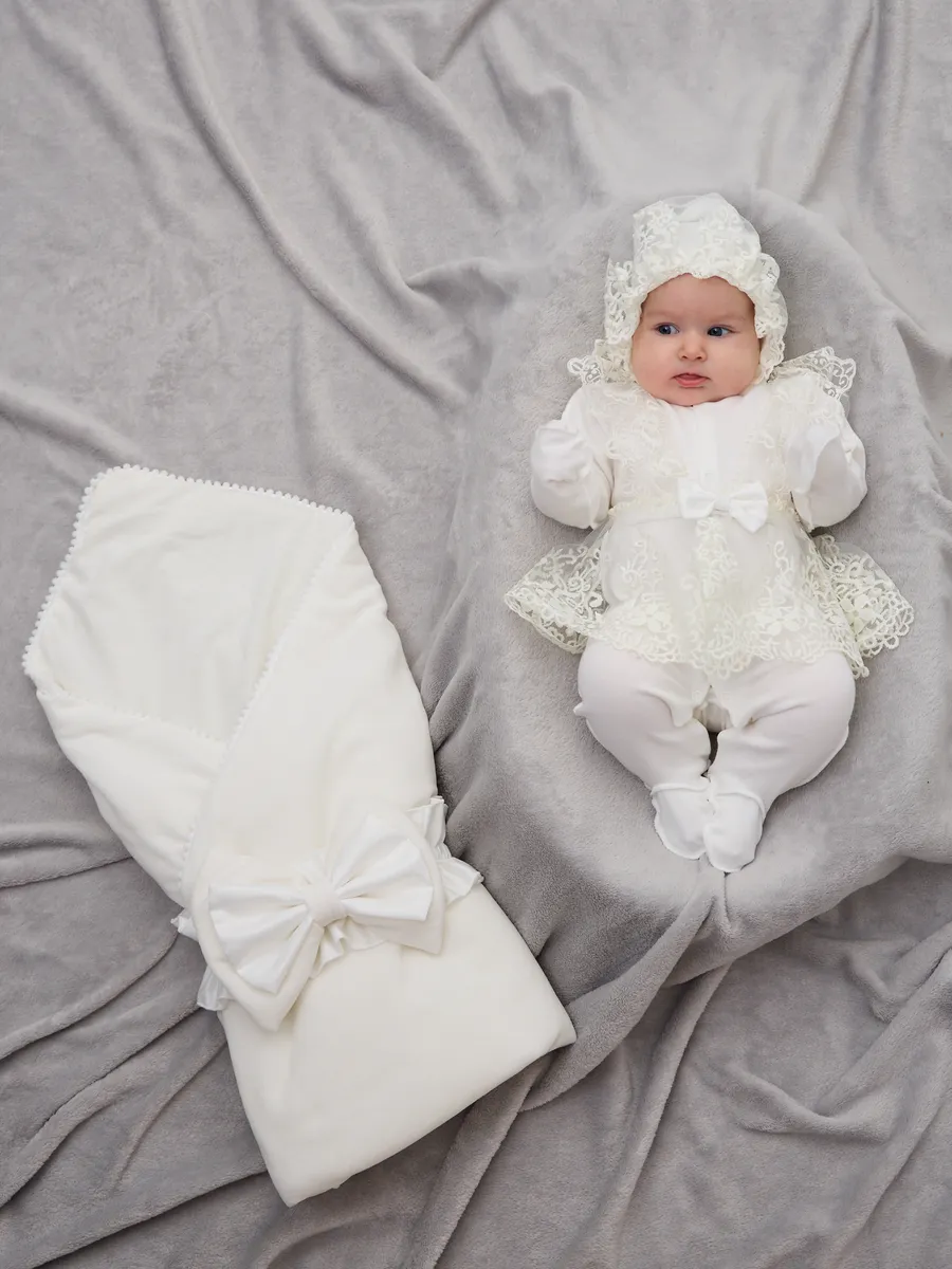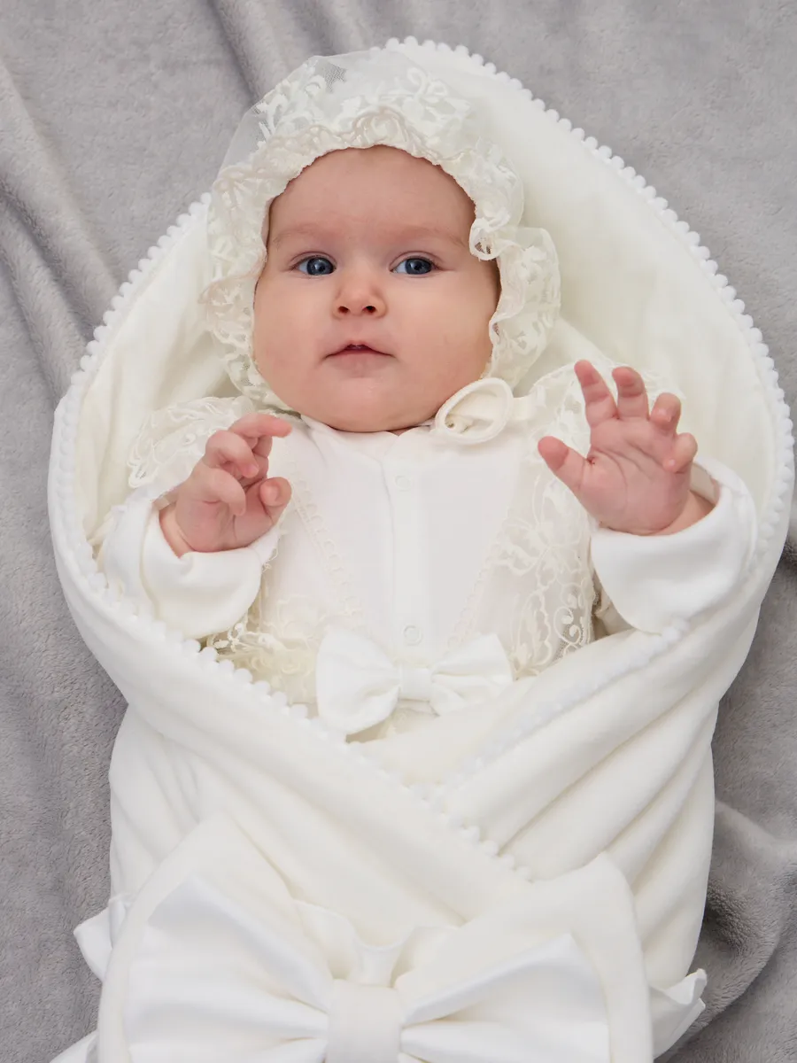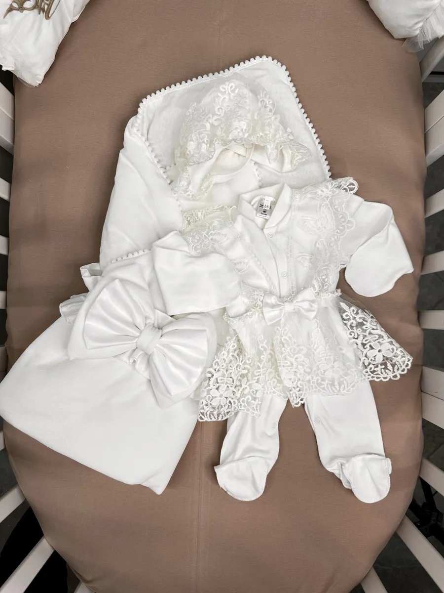 Уникальный комплект на выписку весна-осень – идеальное решение для первых дней жизни вашего малыша вне роддома. Он разработан с заботой о максимальном комфорте и безопасности в прохладное время года. Включает в себя все необходимые элементы: конверт-одеяло, пояс бант на резинке, нательный комбинезон, чепчик, и кружевной сарафан. Каждая деталь коллекции продумана до мелочей, чтобы обеспечить тепло, удобство и стильный внешний вид.
