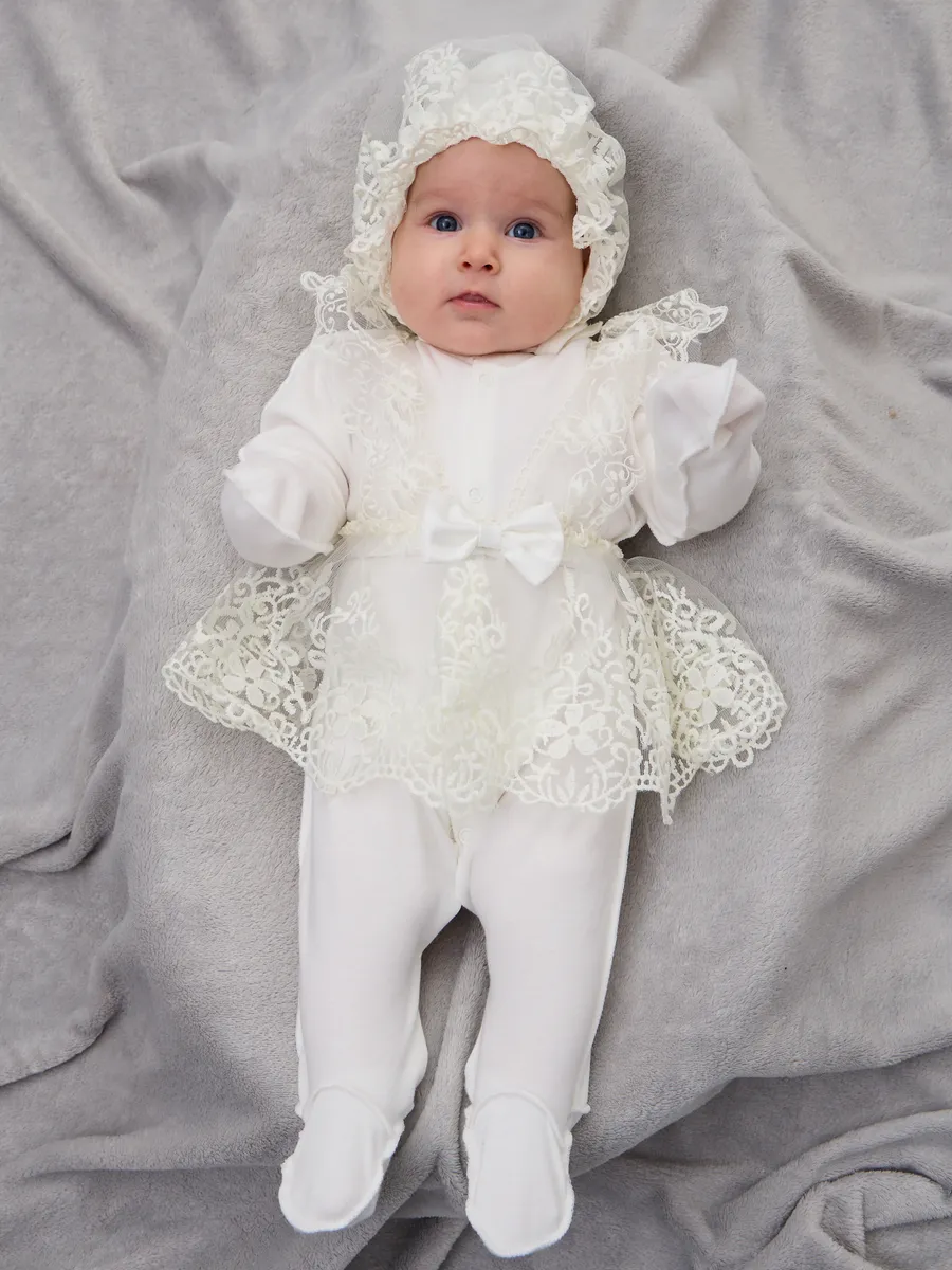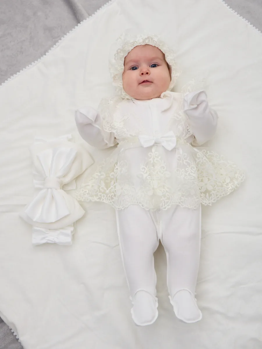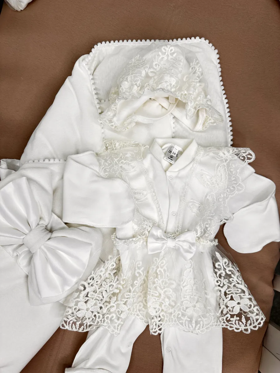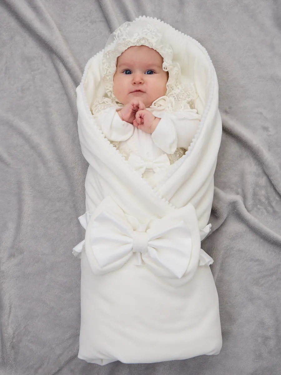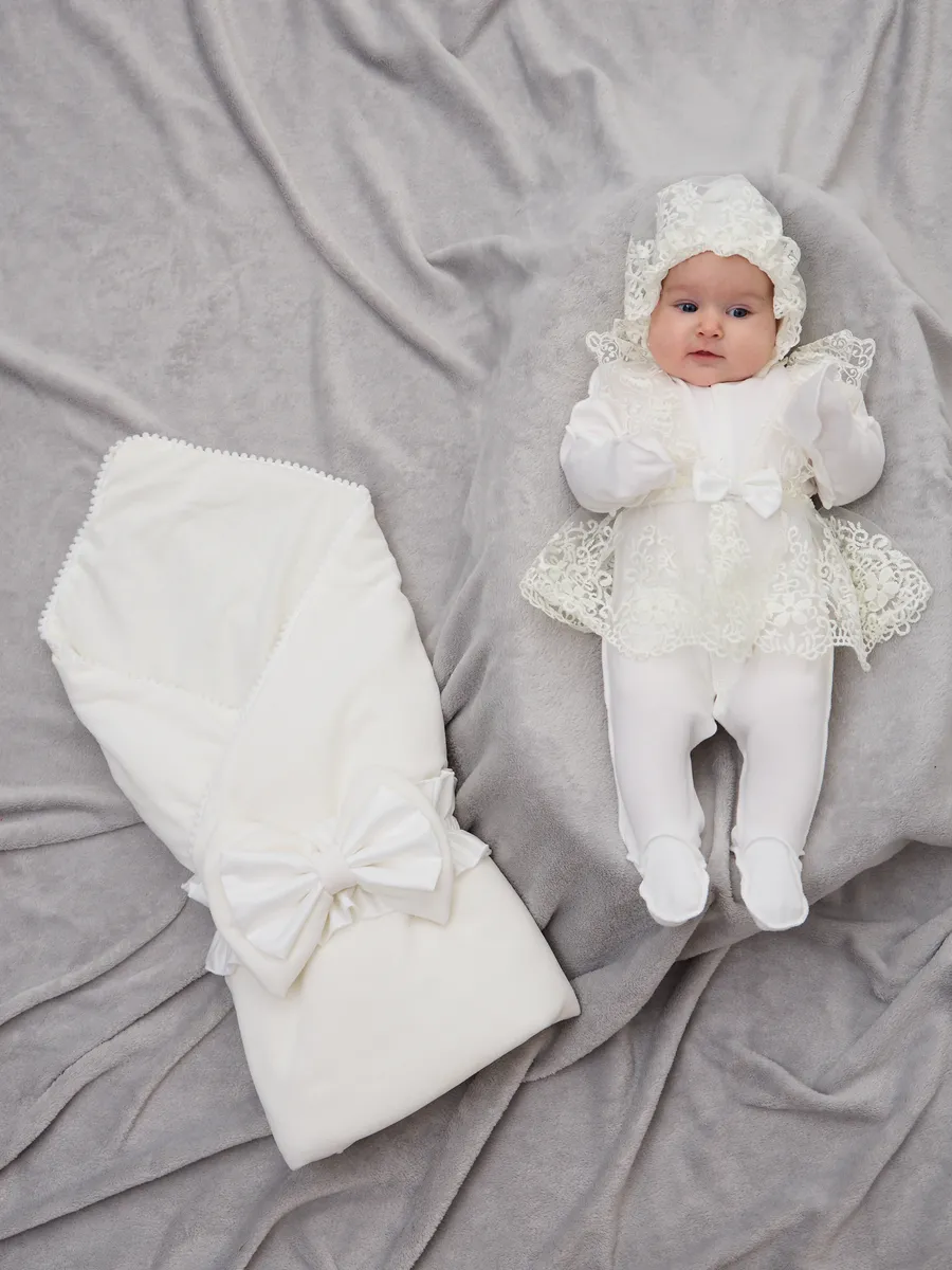 Уникальный комплект на выписку весна-осень – идеальное решение для первых дней жизни вашего малыша вне роддома. Он разработан с заботой о максимальном комфорте и безопасности в прохладное время года. Включает в себя все необходимые элементы: конверт-одеяло, пояс бант на резинке, нательный комбинезон, чепчик, и кружевной сарафан. Каждая деталь коллекции продумана до мелочей, чтобы обеспечить тепло, удобство и стильный внешний вид.