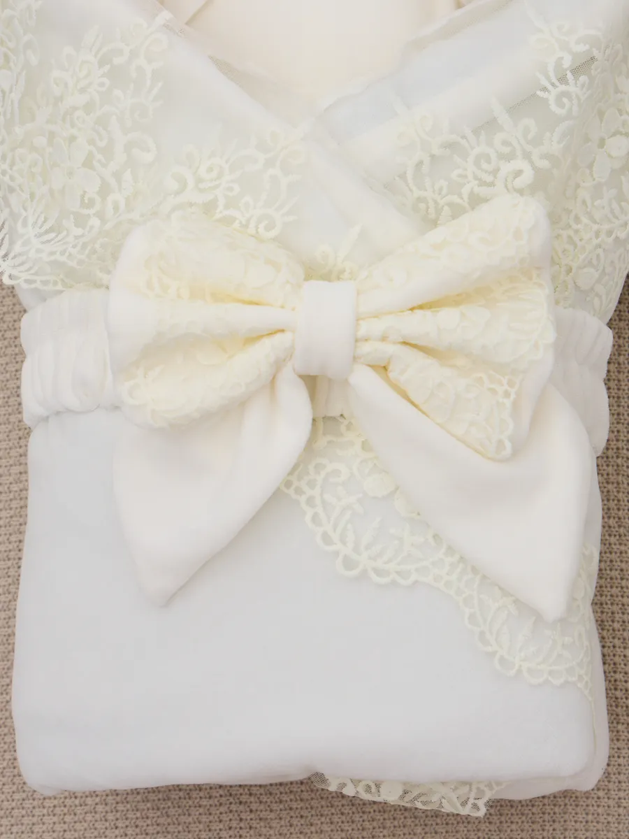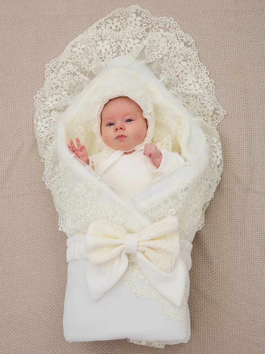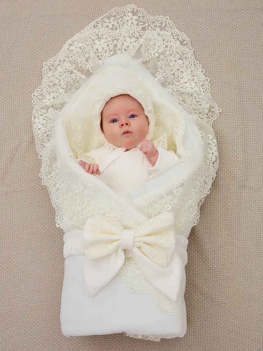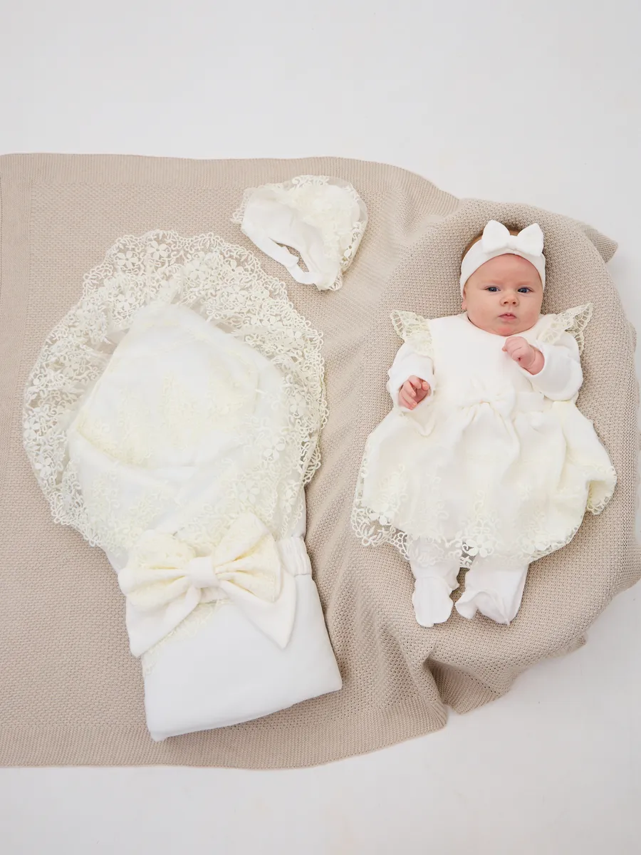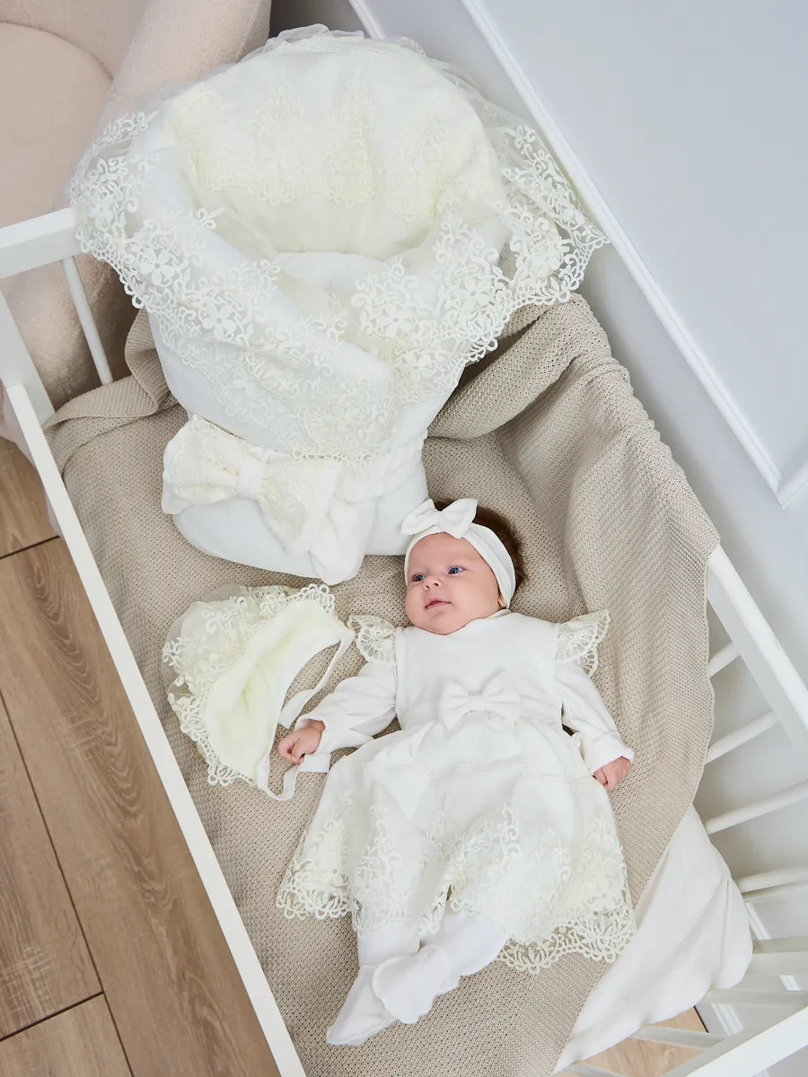 Уникальный комплект на выписку весна-осень – идеальное решение для первых дней жизни вашего малыша вне роддома. Он разработан с заботой о максимальном комфорте и безопасности в прохладное время года. Включает в себя все необходимые элементы: конверт-одеяло со съемным кружевом, нательный комбинезон, чепчик, повязка на голову и платье кружевное, пояс-бант на резинке. Каждая деталь коллекции продумана до мелочей, чтобы обеспечить тепло, удобство и стильный внешний вид.
