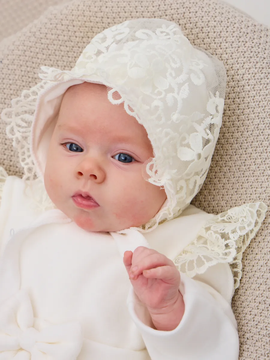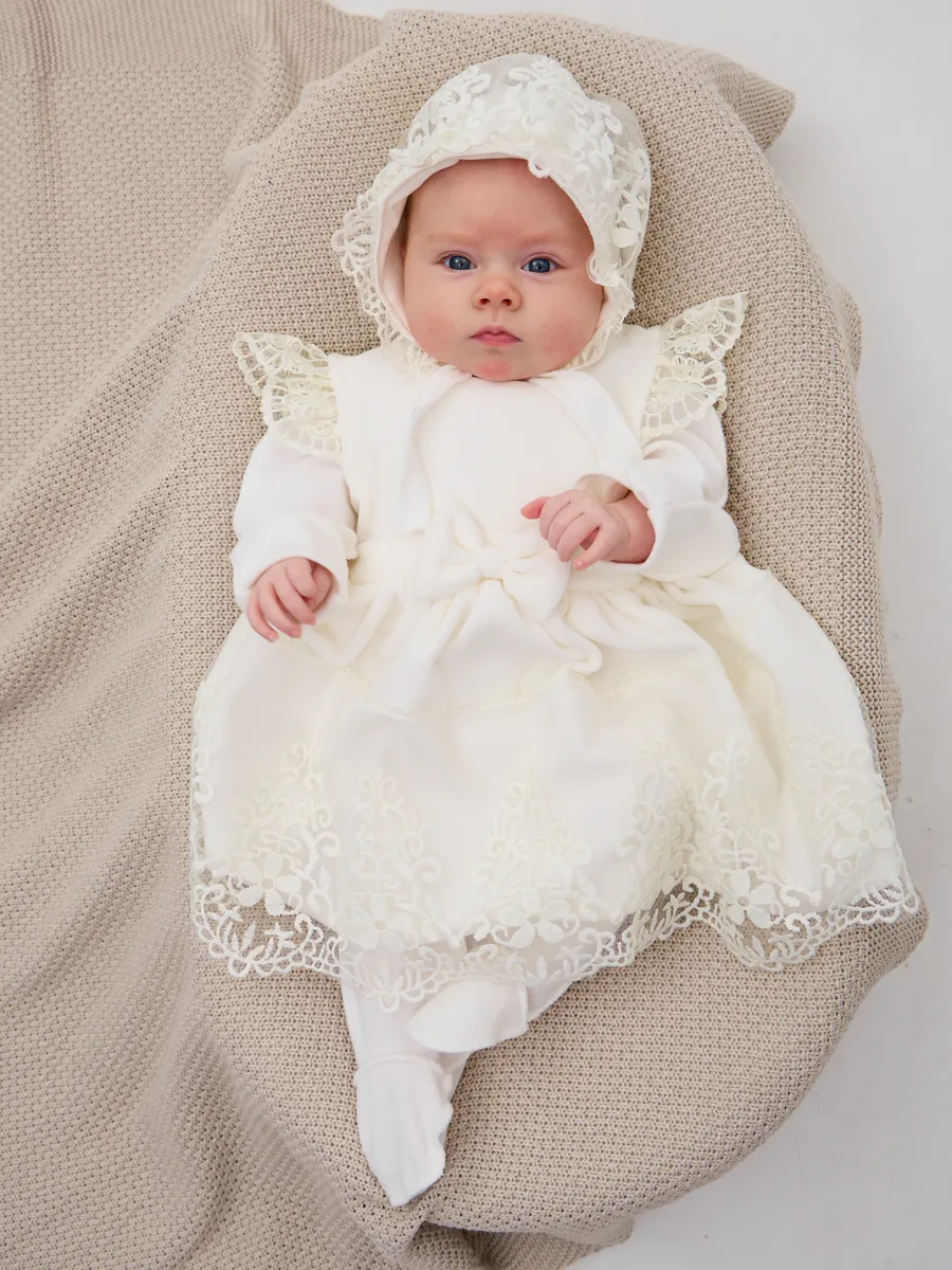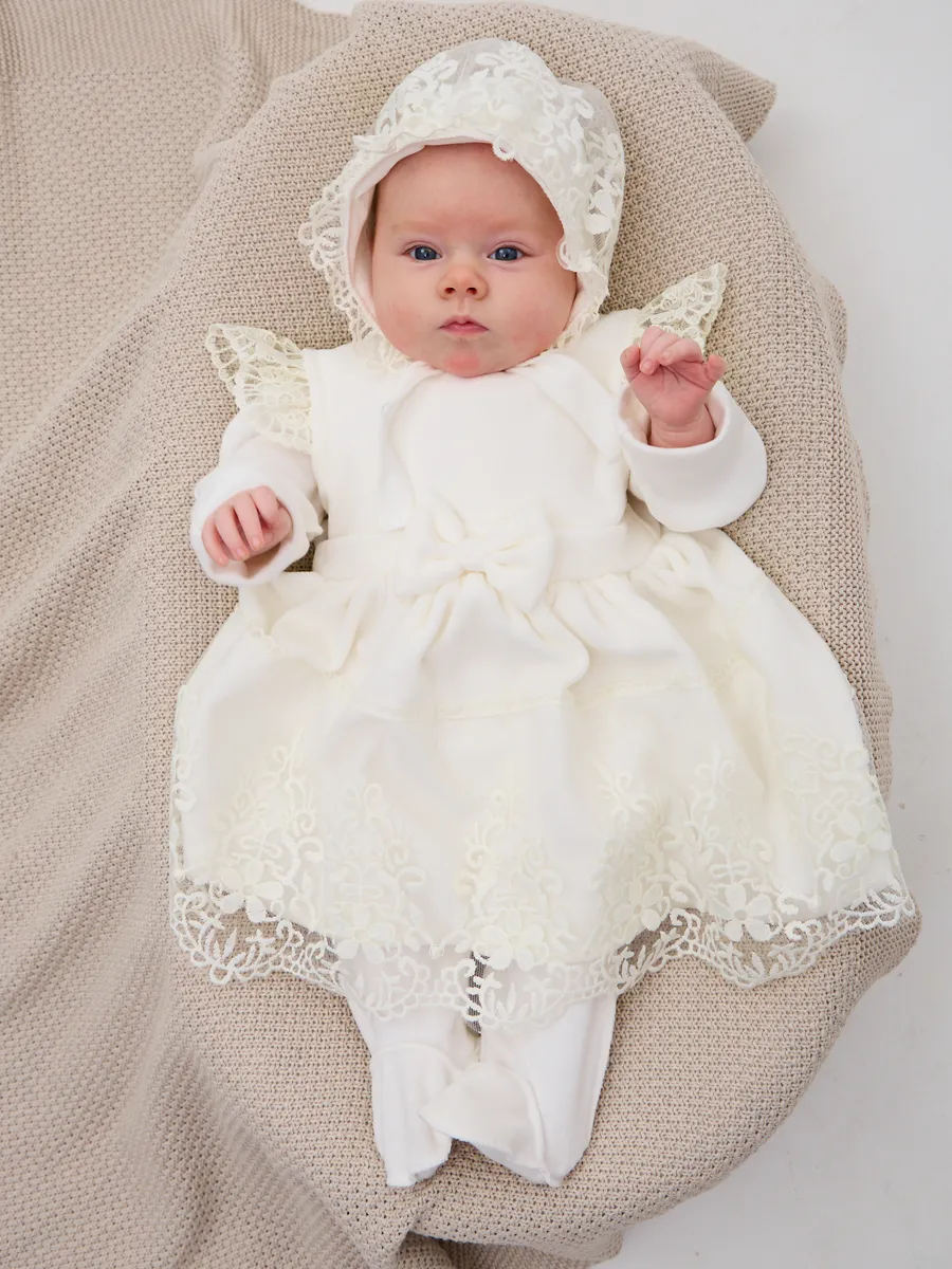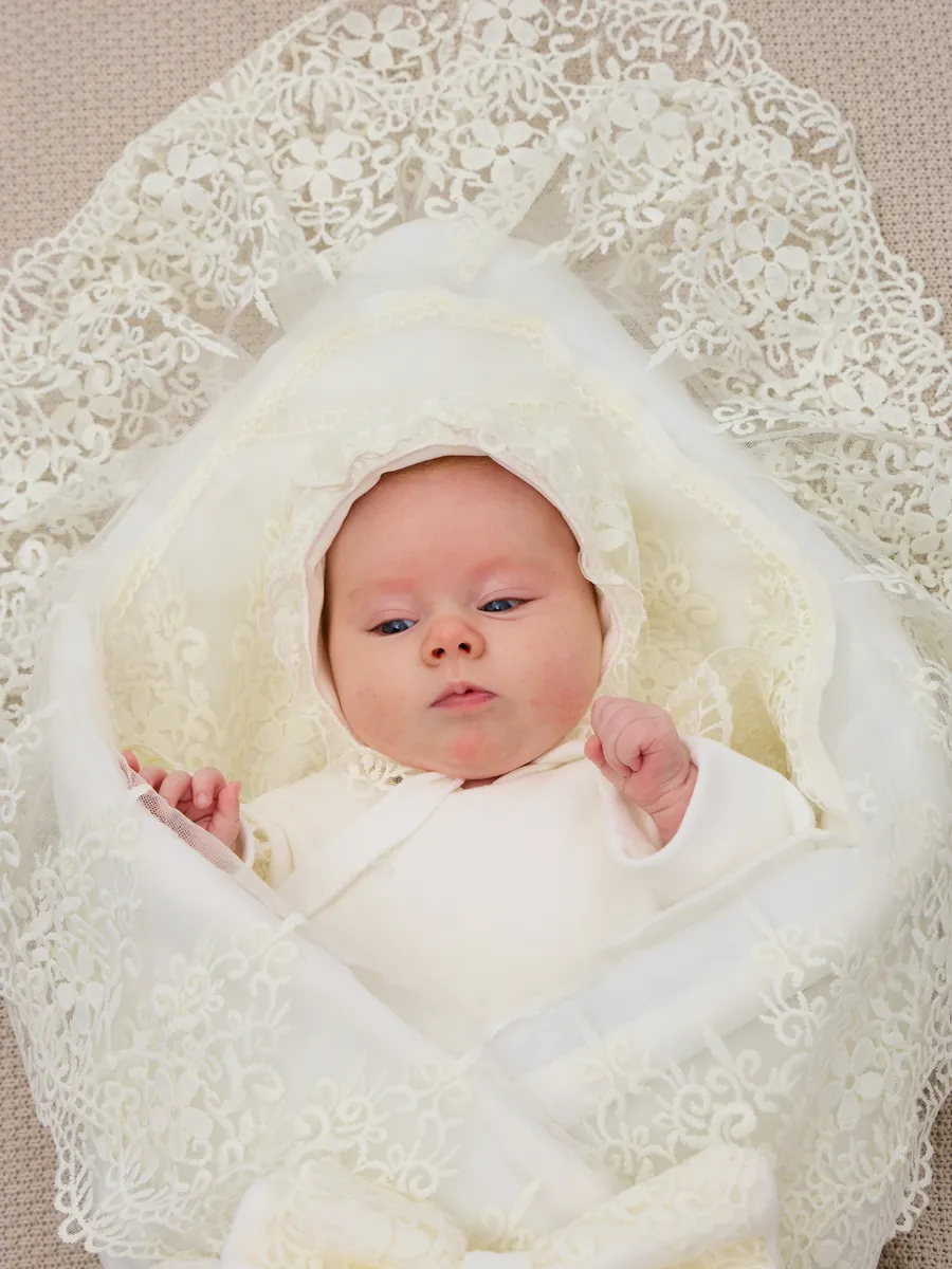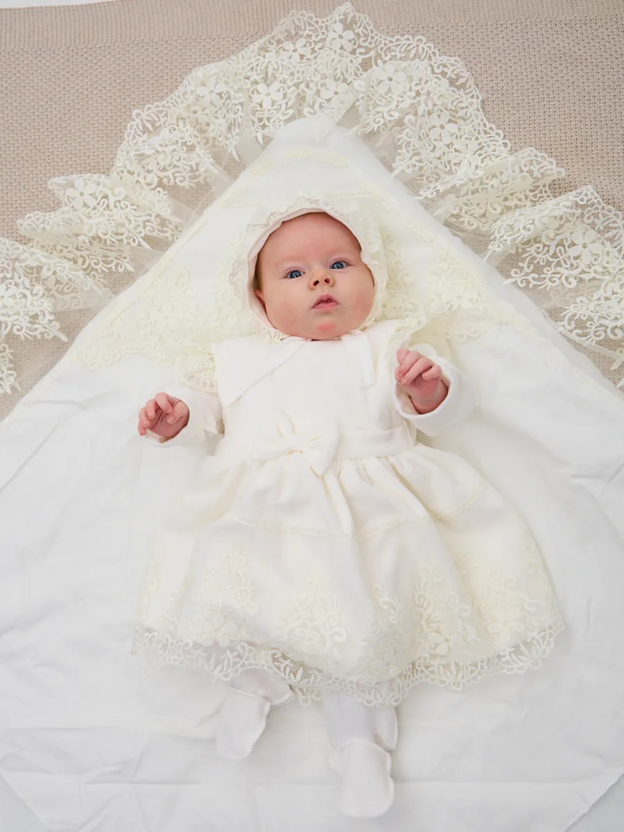 Уникальный комплект на выписку весна-осень – идеальное решение для первых дней жизни вашего малыша вне роддома. Он разработан с заботой о максимальном комфорте и безопасности в прохладное время года. Включает в себя все необходимые элементы: конверт-одеяло со съемным кружевом, нательный комбинезон, чепчик, повязка на голову и платье кружевное, пояс-бант на резинке. Каждая деталь коллекции продумана до мелочей, чтобы обеспечить тепло, удобство и стильный внешний вид.