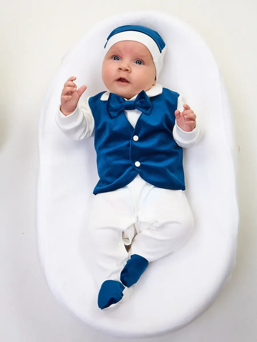 Нательный комбинезон для новорожденного с шапочкой «Джентльмен». Этот наряд декорирован жилеткой-обманкой и бабочкой, что придаёт образу особую изысканность. Аппликация из страз в виде герба России на жилетке и шапочке делает наряд ещё более привлекательным.