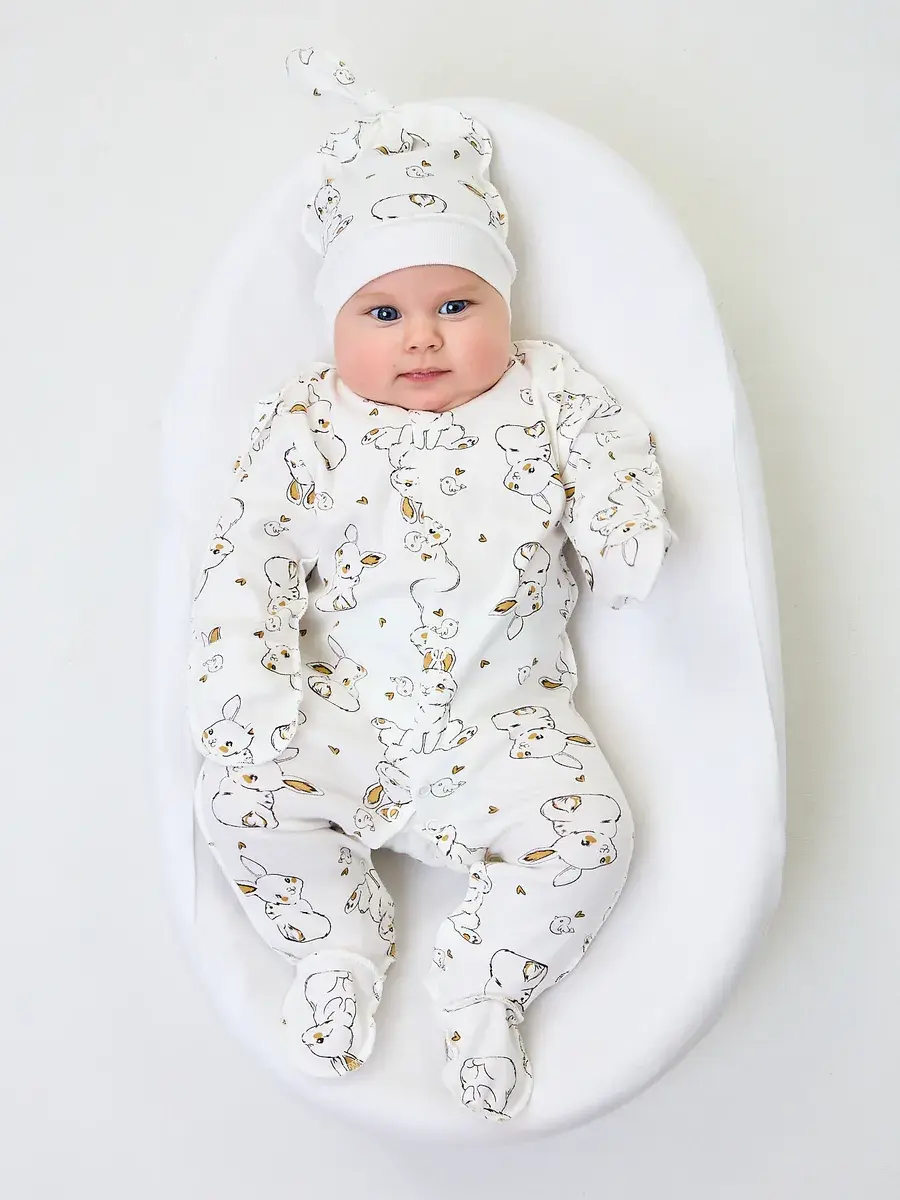 Благодаря своей мягкости и теплоте, конверт-одеяло обеспечит комфорт и уют вашему малышу в первые дни его жизни. Вы можете использовать его в кроватке или коляске, чтобы создать для ребенка ощущение безопасности и защищенности. Хлопковый комбинезон для новорожденного и шапочка с узелком швами наружу. Размер 56. Изготовлен из натуральной хлопковой ткани- интерлок пенье ( трикотаж высшего ачества). Милый принт зайки и очень удобная модель - кнопочки застегиваются по всей длине комбинезона. Вы нас очень поддержите оставив свой отзыв после покупки! Благодарим за выбор и доверие! В нашем беби-шопе большой ассортимент конвертов на выписку и одежды для новорожденных.