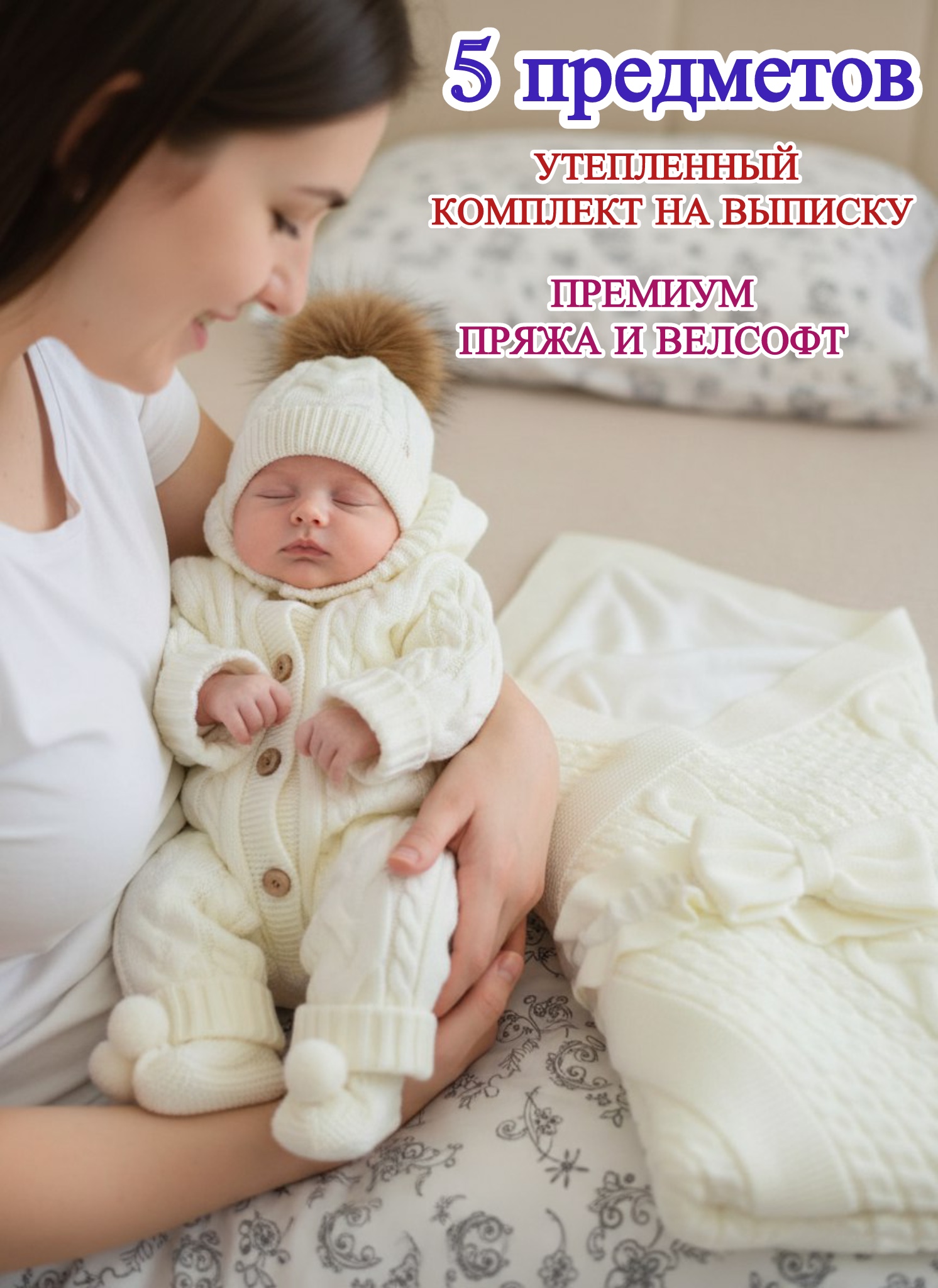 Представляем вам идеальный комплект на выписку новорожденного вязаный набор из 5 предметов. Он включает в себя самые необходимые вещи для первых дней жизни малыша: плед, пояс, шапочку, пинетки и тёплый комбинезон с капюшоном. Конверт на выписку состоит из вязаного пледа размером 120x80 см, утеплённого экомехом (велсофт). Он надёжно фиксируется на малыше благодаря поясу-банту на резинке, не пережимая его тело. Также в комплект входит шапочка размером 40 на завязках с милым помпоном. И, конечно же, вязаные пинетки — они изготовлены из турецкой премиум-пряжи, как и весь зимний конверт.