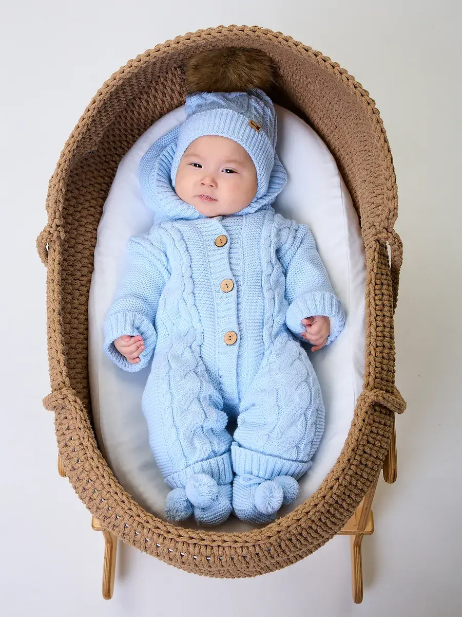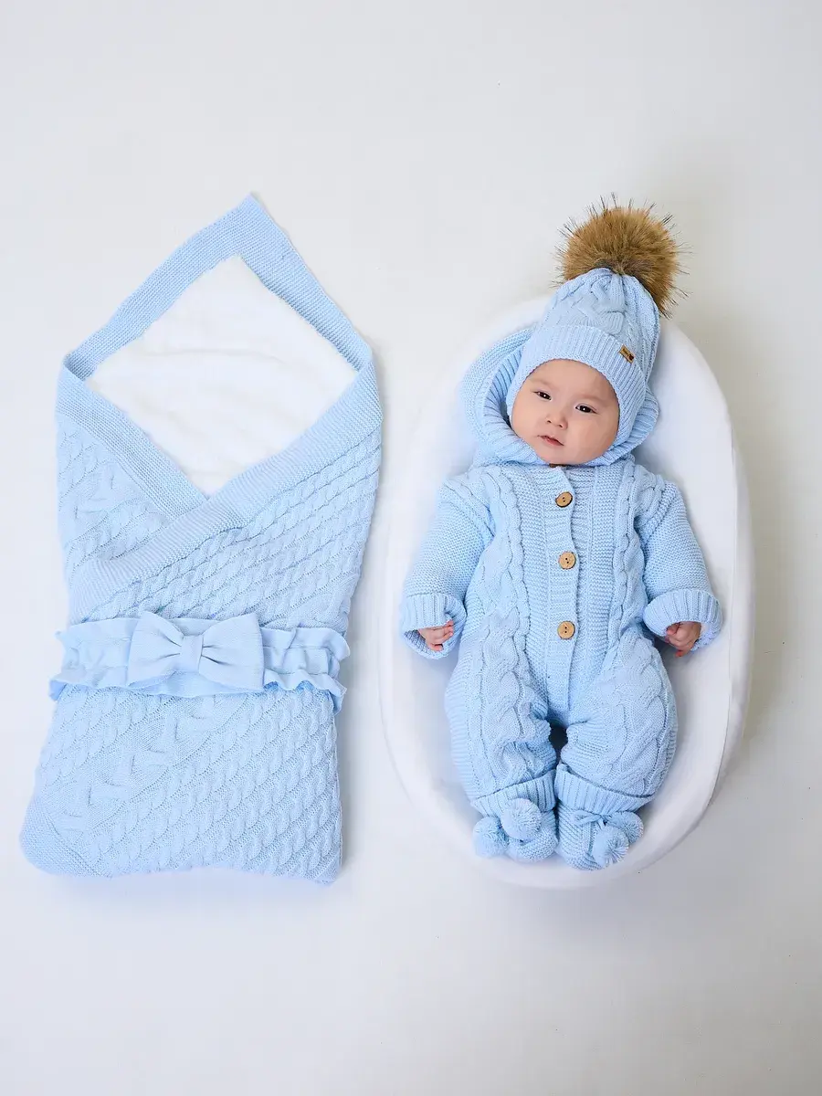 Представляем вам идеальный комплект на выписку новорожденного вязаный набор из 5 предметов. Он включает в себя самые необходимые вещи для первых дней жизни малыша: плед, пояс, шапочку, пинетки и тёплый комбинезон с капюшоном. Конверт на выписку состоит из вязаного пледа размером 120x80 см, утеплённого экомехом (велсофт). Он надёжно фиксируется на малыше благодаря поясу-банту на резинке, не пережимая его тело. Также в комплект входит шапочка размером 40 на завязках с милым помпоном. И, конечно же, вязаные пинетки — они изготовлены из турецкой премиум-пряжи, как и весь зимний конверт.