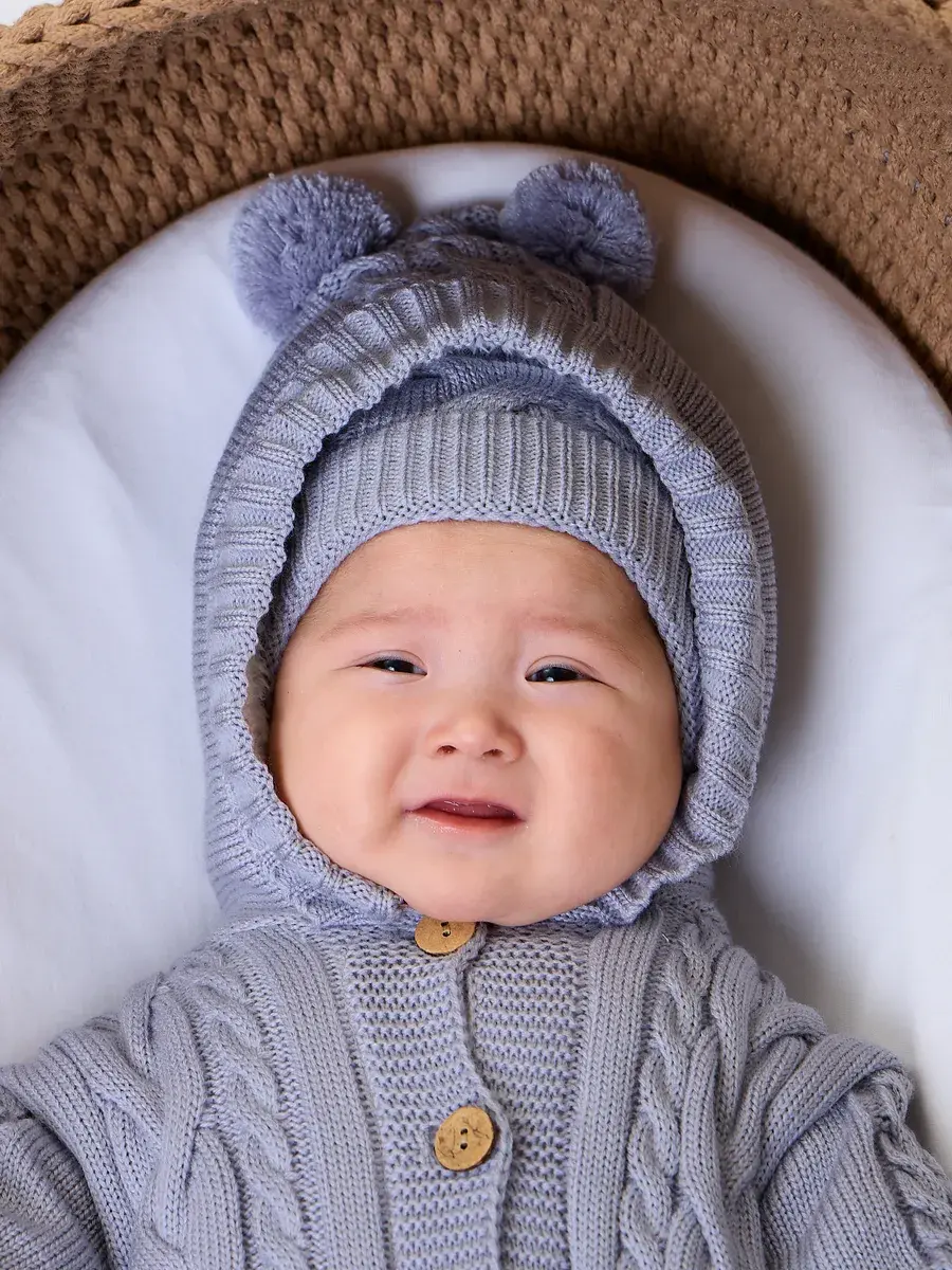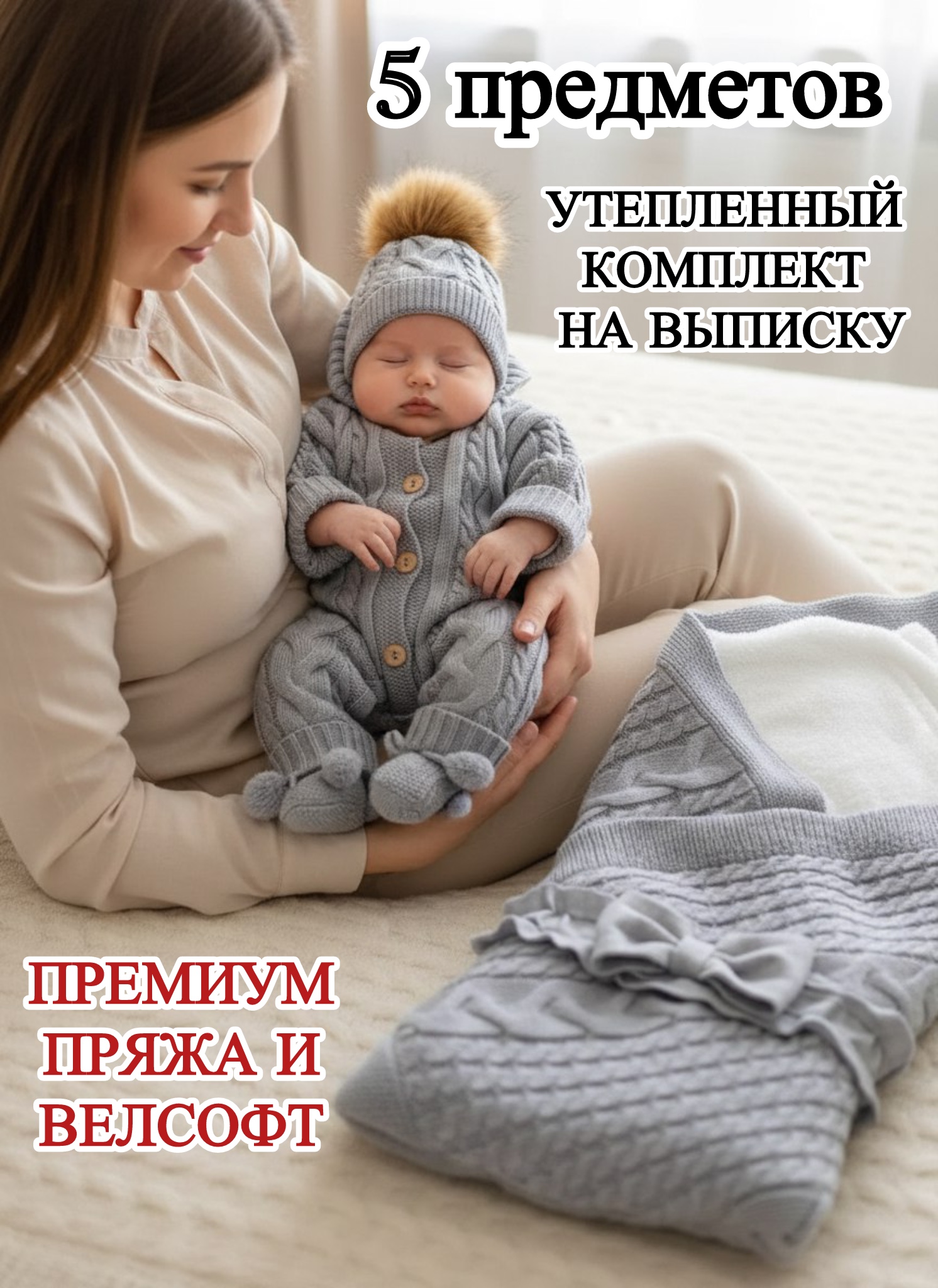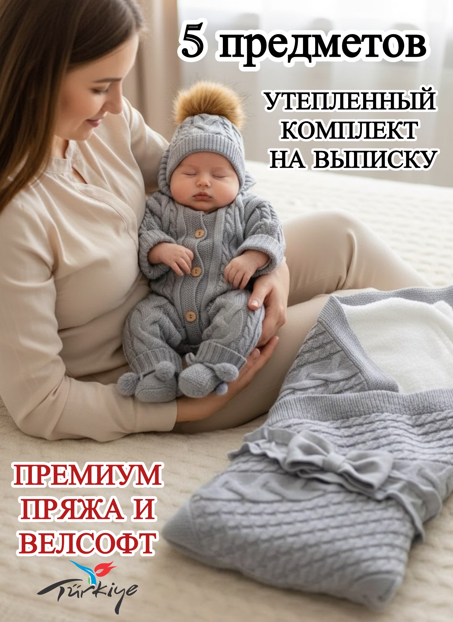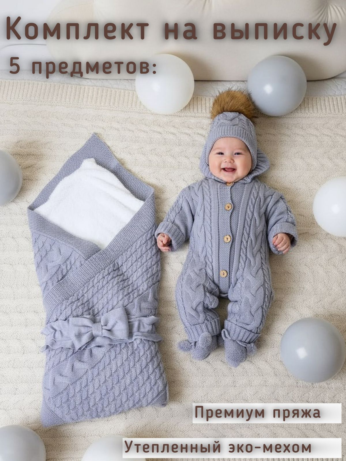 Представляем вам идеальный комплект на выписку новорожденного вязаный набор из 5 предметов. Он включает в себя самые необходимые вещи для первых дней жизни малыша: плед, пояс, шапочку, пинетки и тёплый комбинезон с капюшоном. Конверт на выписку состоит из вязаного пледа размером 120x80 см, утеплённого экомехом (велсофт). Он надёжно фиксируется на малыше благодаря поясу-банту на резинке, не пережимая его тело. Также в комплект входит шапочка размером 40 на завязках с милым помпоном. И, конечно же, вязаные пинетки — они изготовлены из турецкой премиум-пряжи, как и весь зимний конверт.