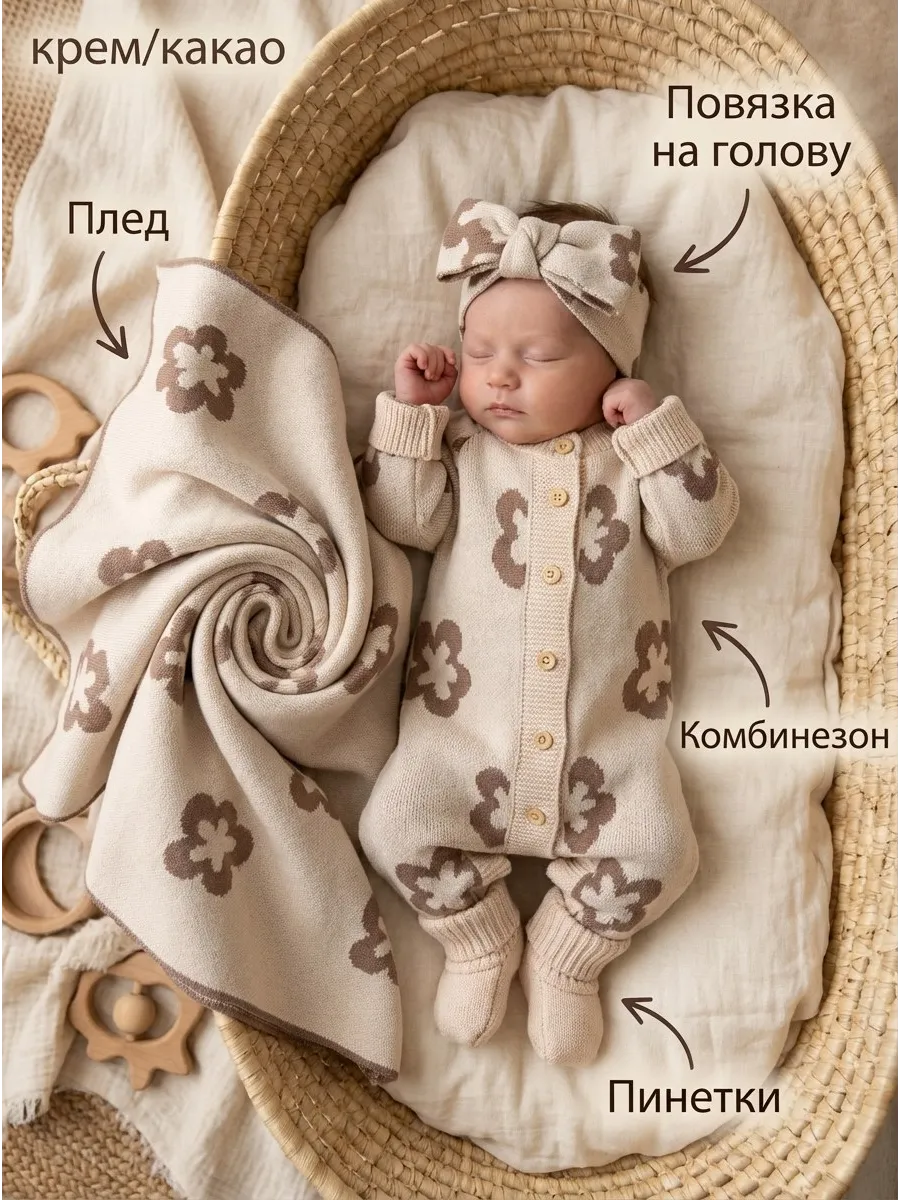 Вязаный комплект для новорожденного сочетает в себя высокое качество материалов, нежные оттенки и уютный дизайн, идеально подходящий для новорожденных.
